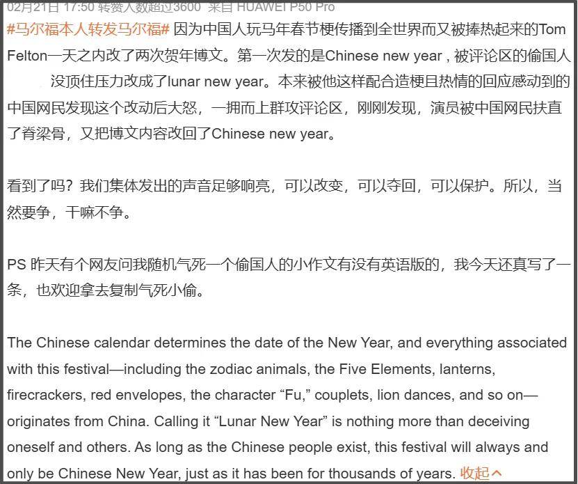 还好,在中国网友据理力争之下,汤姆·费尔顿修正了错误,改回了“Chinese New Year”。