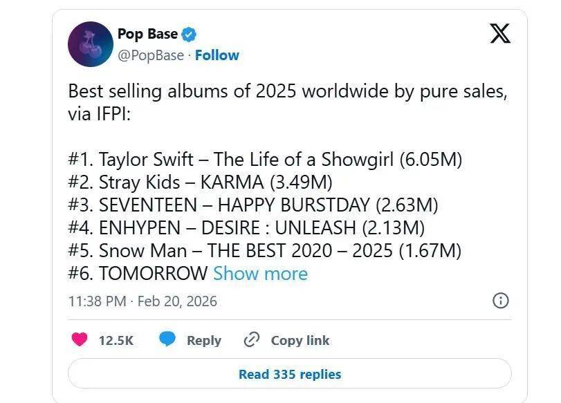 根据IFPI发布的2025年全球专辑纯销量榜,K-Pop军团可谓大获全胜,前二十名中独占十三席,Stray Kids、SEVENTEEN、ENHYPEN等团体赫然在列,连排名第20的IVE专辑销量也明确标注为107万张。然而,今年三月发行、并曾高调宣布首周销量便突破百万的《Ruby》,却在整个榜单中不见踪影。