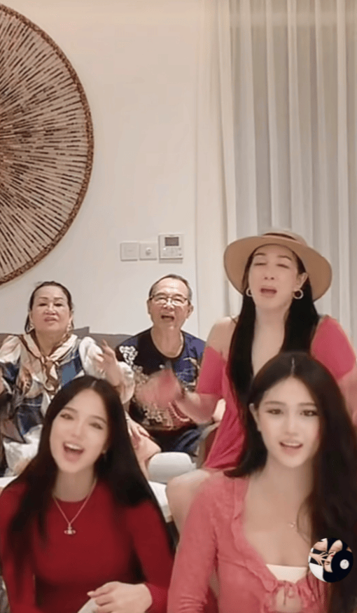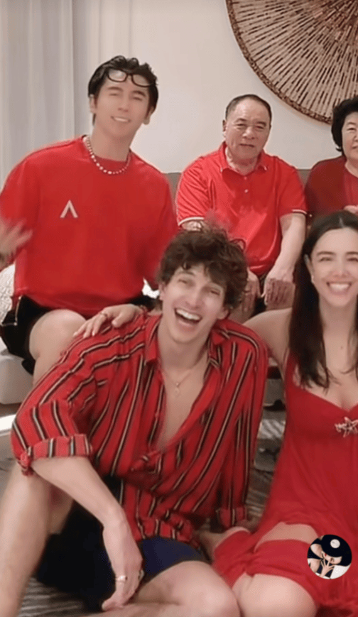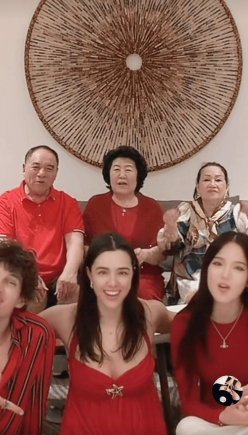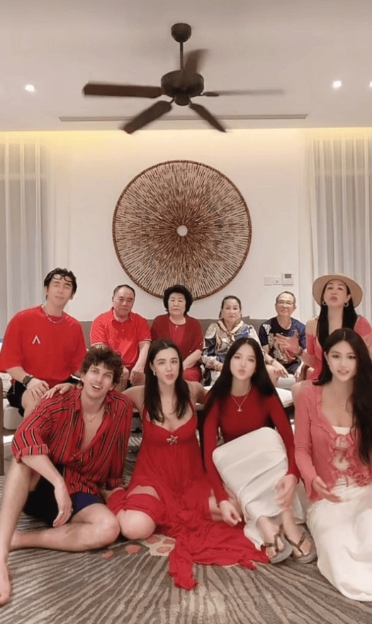 有了大女儿男友的对比,张伦硕立马就有了老父亲的既视感,老花眼镜都要带上了,一家人穿着喜庆的红色,高堂坐后面,张伦硕和钟丽缇坐两编,几个孩子坐中间,大女儿张敏钧皮肤却是最白的,颜值很高,穿着大红色吊带低胸裙,让这么多长辈看着真是不好。