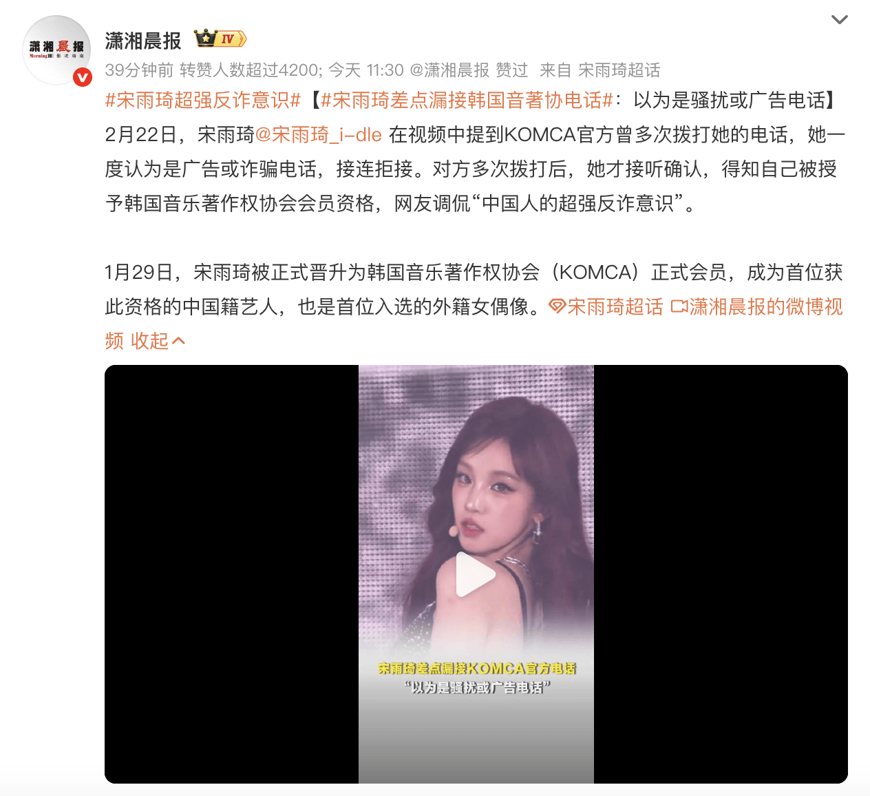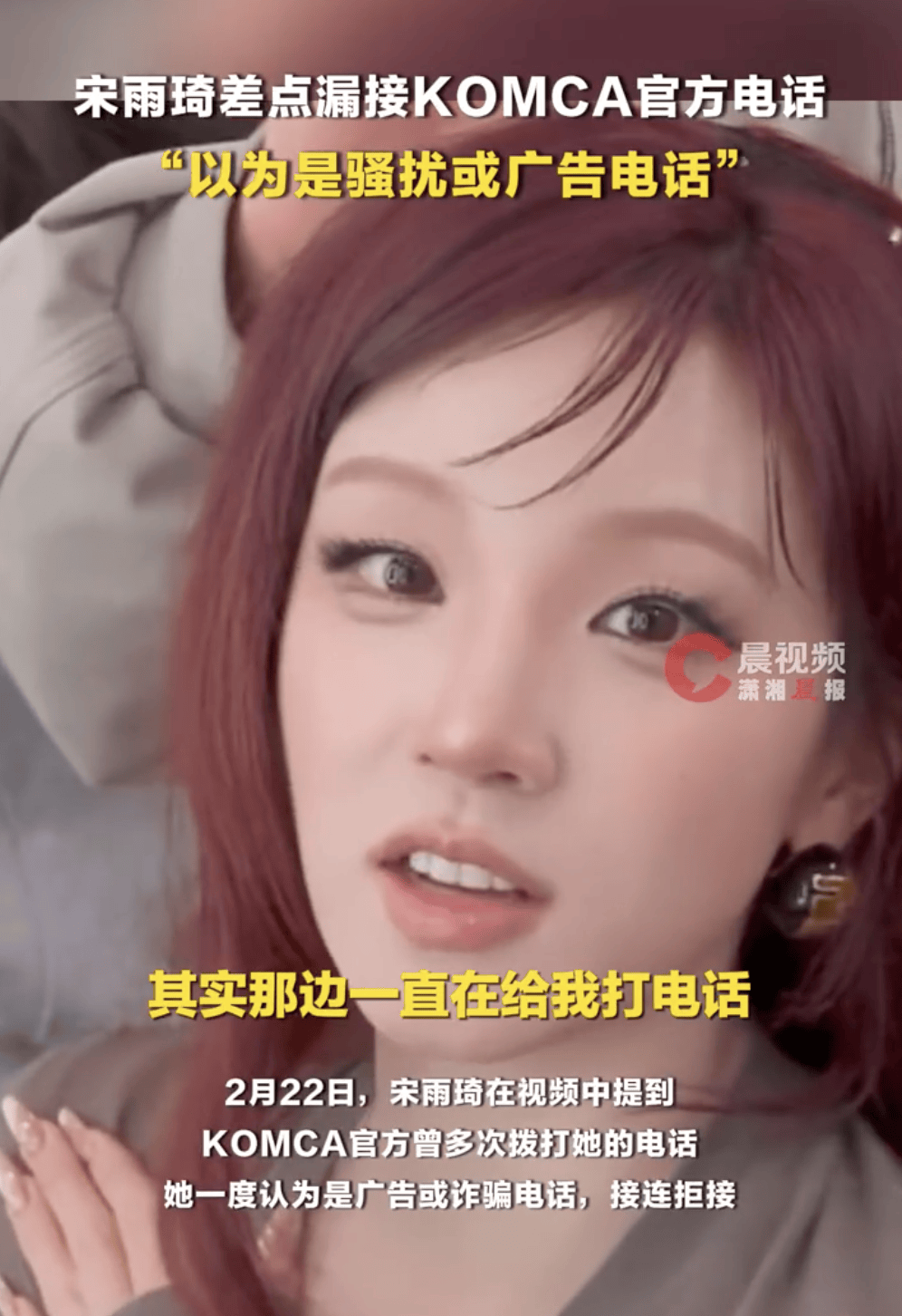 (来源:潇湘晨报)2月22日,宋雨琦在视频中提到KOMCA官方曾多次拨打她的电话,她一度认为是广告或诈骗电话,接连拒接。对方多次拨打后,她才接听确认,得知自己被授予韩国音乐著作权协会