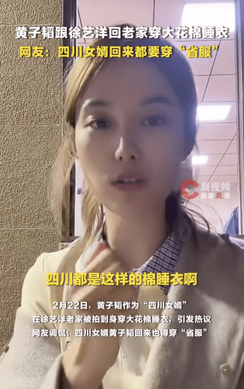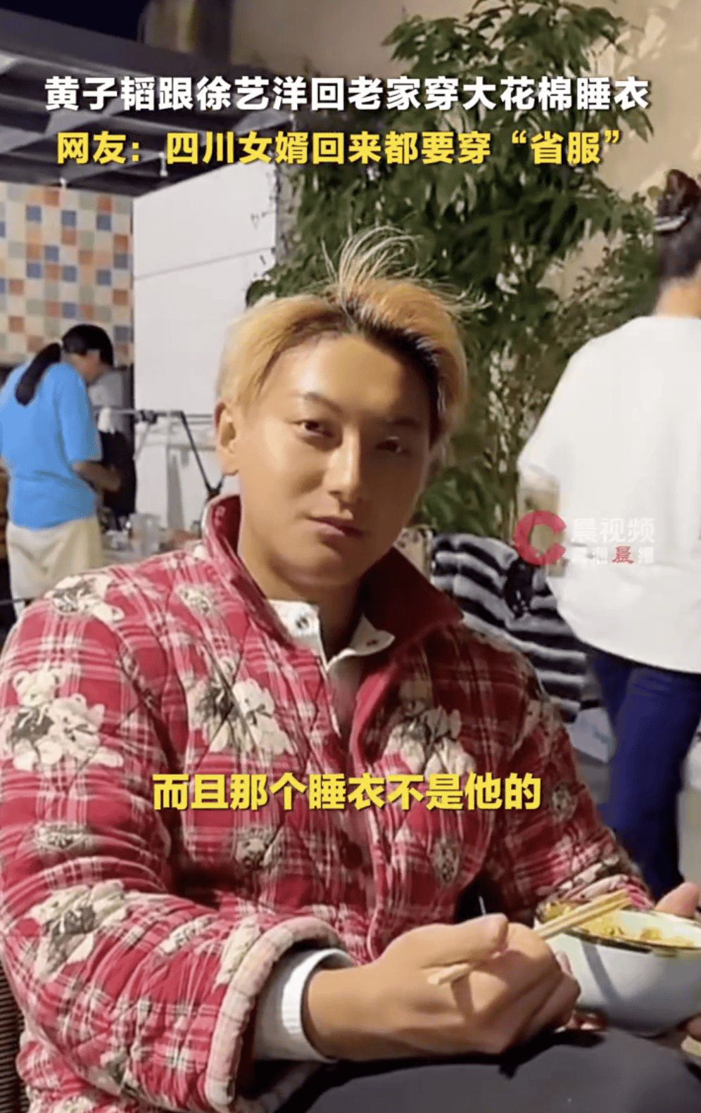 (来源:潇湘晨报)2月22日,黄子韬作为“四川女婿”,在徐艺洋老家被拍到身穿大花棉睡衣,这件睡衣还是徐艺洋舅舅穿的。网友调侃:四川女婿黄子韬回来也得穿“省服&rdqu