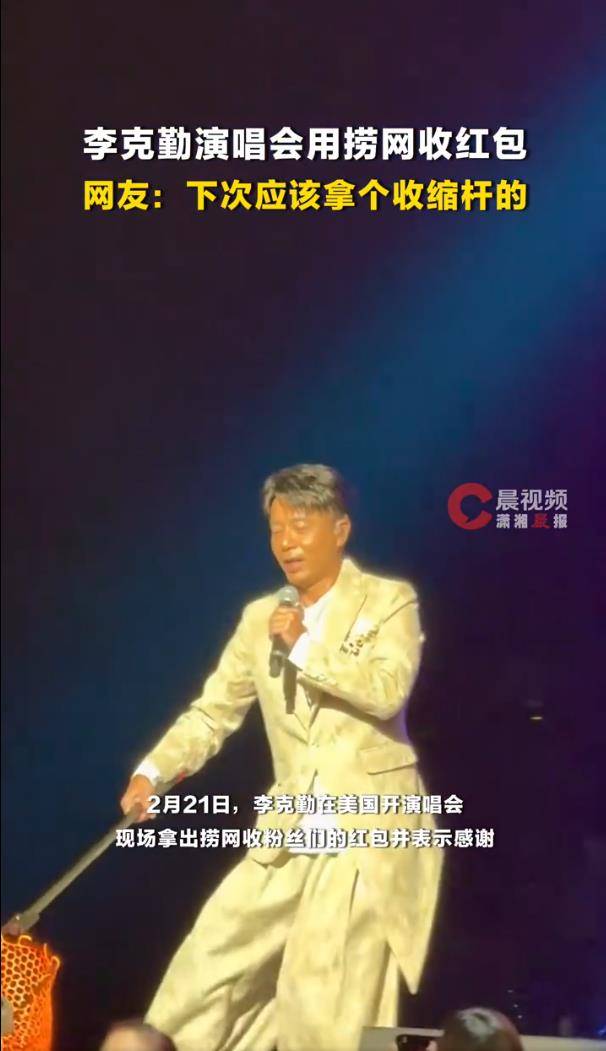 据2月22日报道,李克勤在美国的演唱会现场,上演了一幕让海外观众大开眼界的“名场面”:只见他手持一个特制大型捞网,站在舞台边,像捞鱼一样“打捞”台下粉丝们递上来的红包。红包多到几乎装满网兜,场面既壮观又搞笑,被网友戏称为“红包收到手软”。