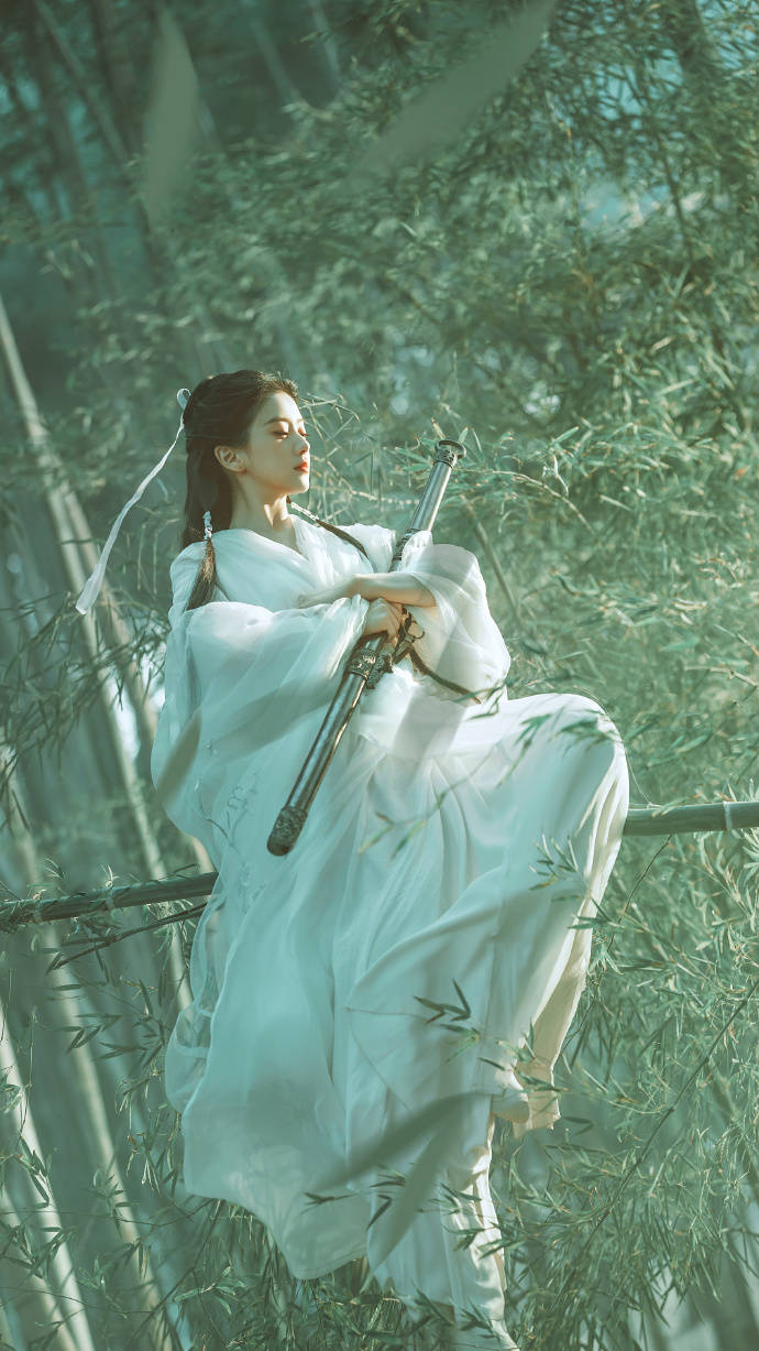 包上恩以白衣造型置身竹林,发带与衣袂随风翻飞,她在枝头打坐、剑挑竹叶等画面融合传统武侠的写意感。
