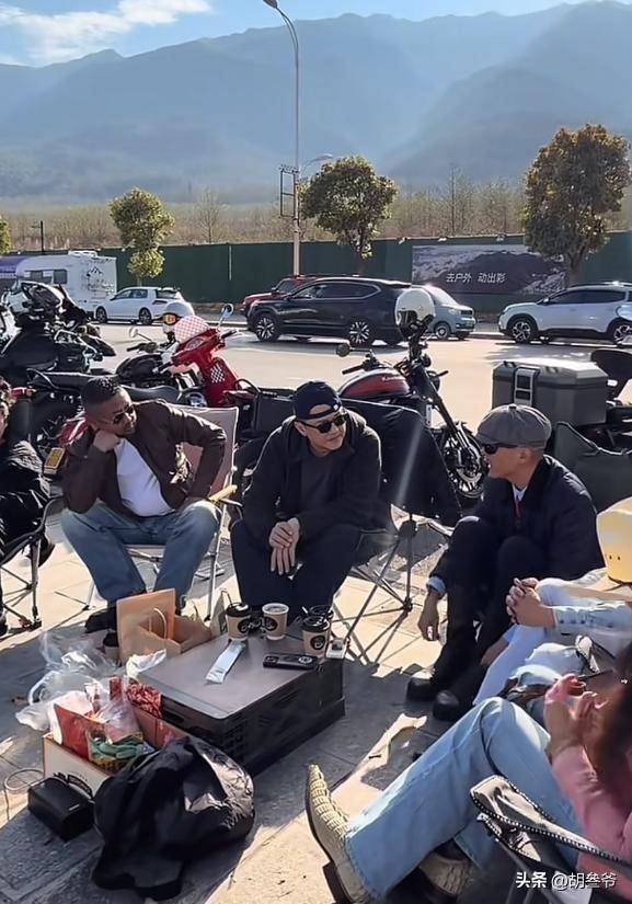 两人没有选择高档餐厅,而是直接坐在马路边的空地上,地上摆着一些坚果和咖啡,身后停着一排摩托车,颇有几分江湖老友的洒脱。