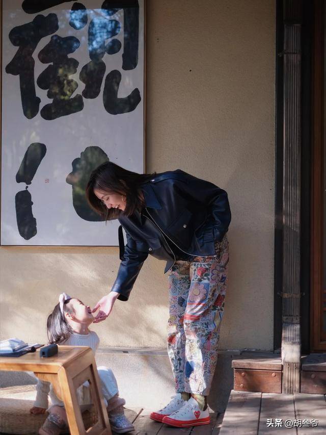 和女儿同框的那张照片更暖,她穿着黑色皮夹克俯身逗夏夏,手轻轻贴在女儿小脸上,逗得夏夏哈哈大笑,她自己也笑开了花,眉眼间的幸福藏都藏不住。