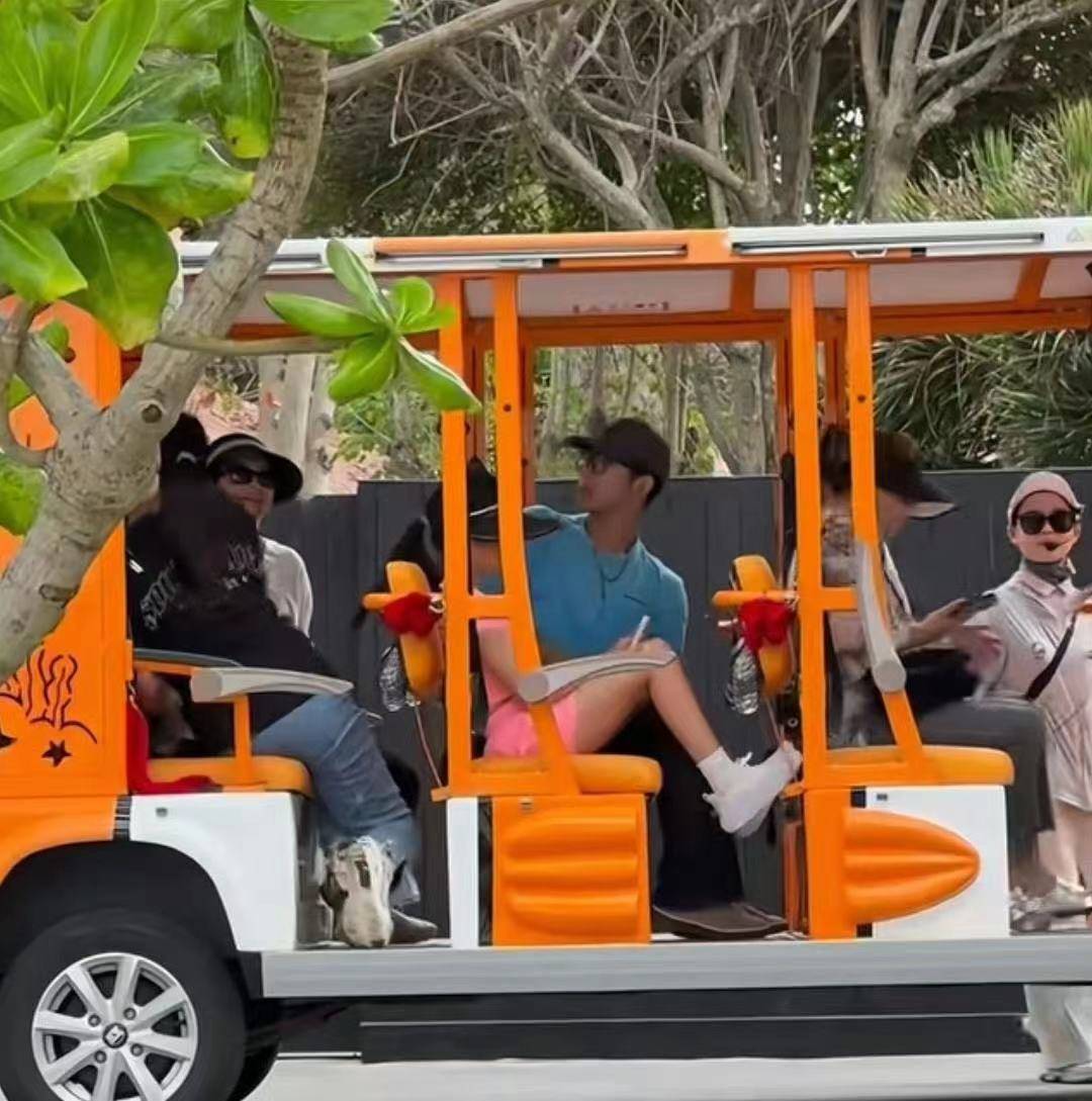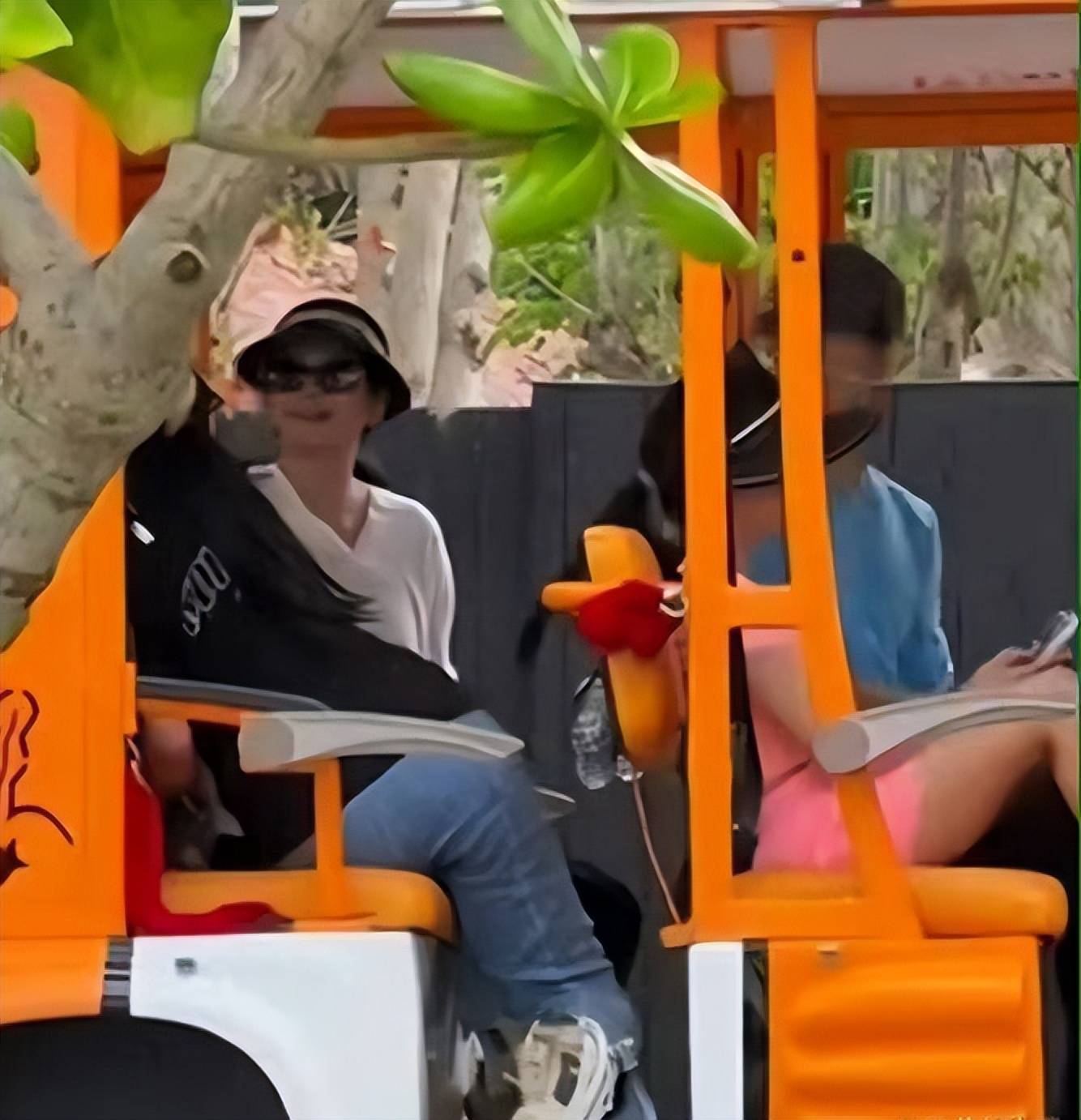 章子怡戴着墨镜,看到有人然后戴上口罩,她身边坐着的可能是侄女,而前排穿蓝色短袖T恤的可能是侄子,而醒醒身穿粉红套装,皮肤晒成小麦颜色,很健康。