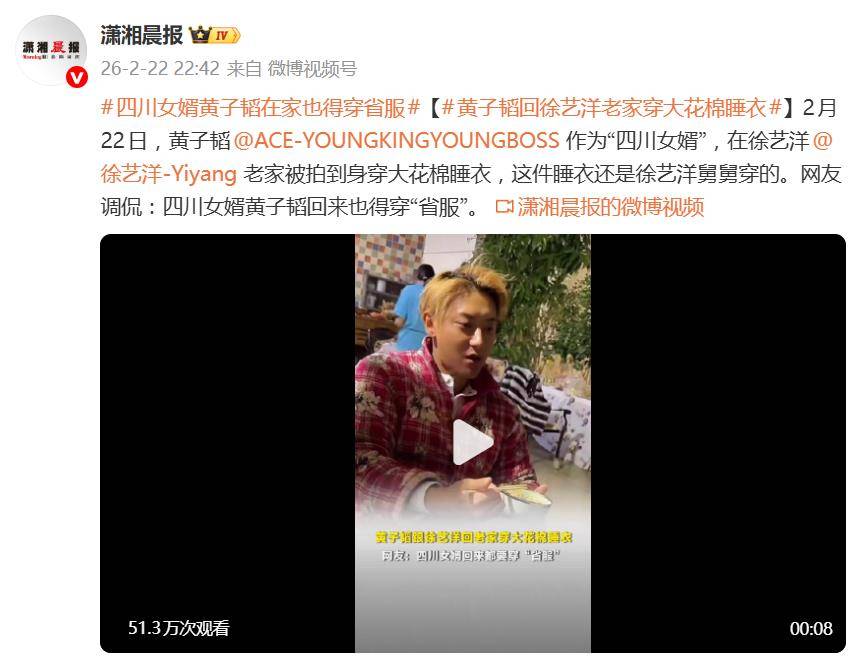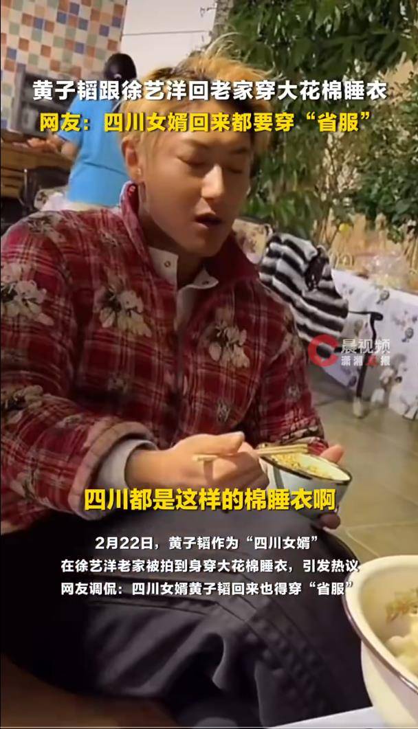 据2月22日报道,当红明星黄子韬的一身行头,在网络上炸开了锅。这位舞台上的酷炫偶像,随妻子徐艺洋回四川南充老家时,竟被拍到身穿一件红底大花棉睡衣,撸串吃饺子,画风突变到让网友直呼:“这是顶流变形记吧!”