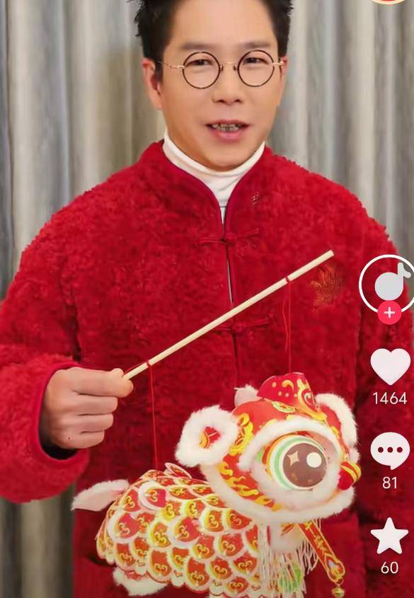 反观另一位港星林晓峰,拜年就要喜庆得多,穿一身大红色,手上提的灯笼还有非遗的醒狮元素,这才更有过中国年的氛围嘛。