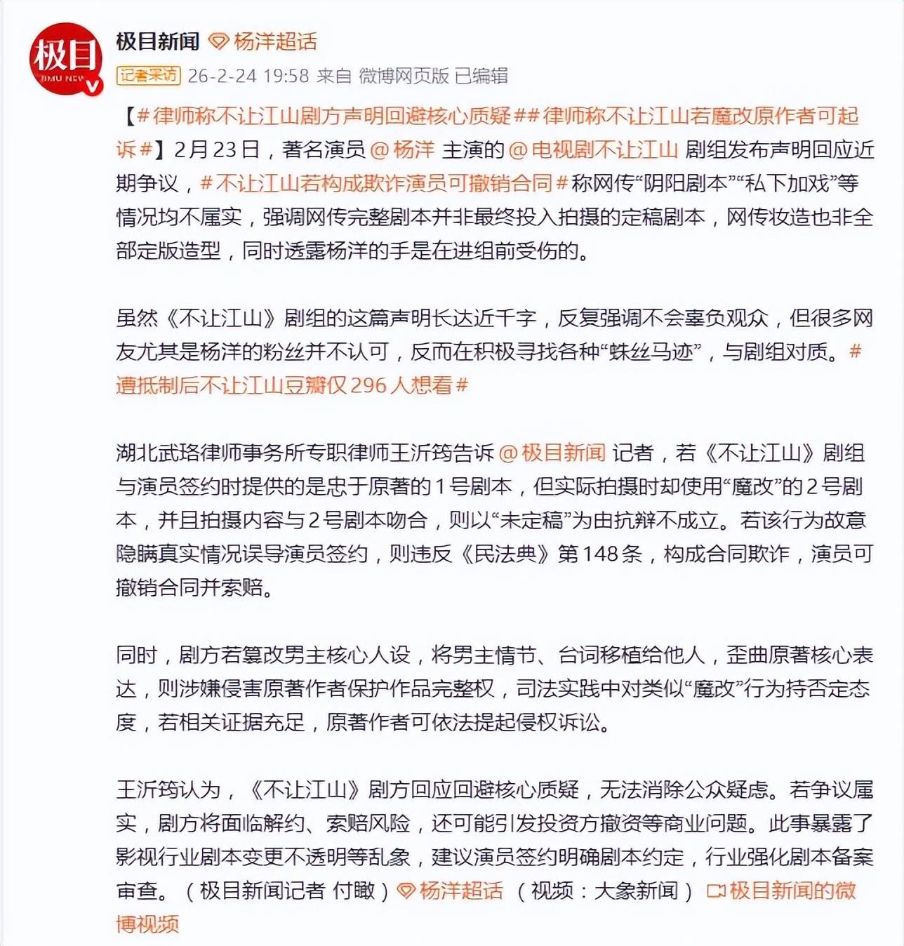 电视剧《不让江山》的开机,没等来“开门红”,反倒先迎来一场关于“阴阳剧本”的舆论风暴。原著作者知白一个取关官博的“静默操作”,被网友解