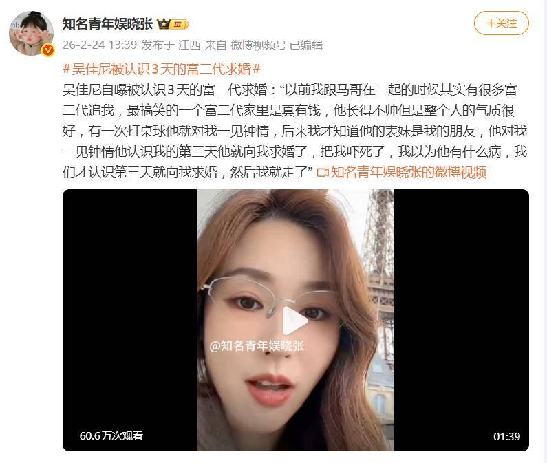 据2月24日网友爆料,演员吴佳尼在直播中自曝的一段早年“抓马”经历,让吃瓜群众手里的瓜都差点惊掉了。她透露,当年在与前夫马景涛交往期间,竟被一个仅认识三天的富二代当众求婚,场面一度失控到让她怀疑人生。