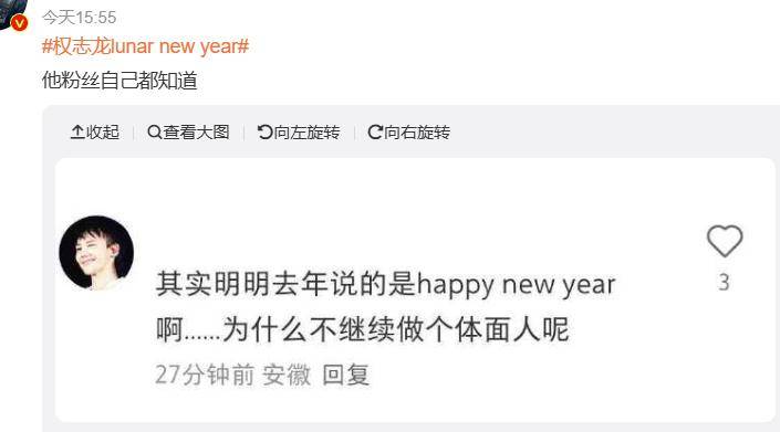 最近,男星权志龙参加音乐节时说春节祝福。用了Lunar New Year的说法,把中国新年“偷”给其他国家了。如果是别的韩星,网友可能嘲嘲就罢了,但偏偏权志龙在内娱也算顶