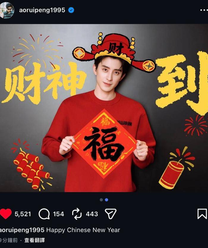 敖瑞鹏最近内外网同步动态,用中文发了“马到成功”等几个大字,自然也在评论区强调了“中国新年”。