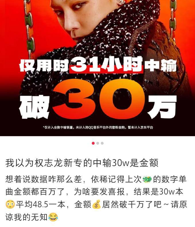 如果是别的韩星,网友可能嘲嘲就罢了,但偏偏权志龙在内娱也算顶流,去年新专辑直接创造中输记录,销量高到网友把销量误会成总销售额。