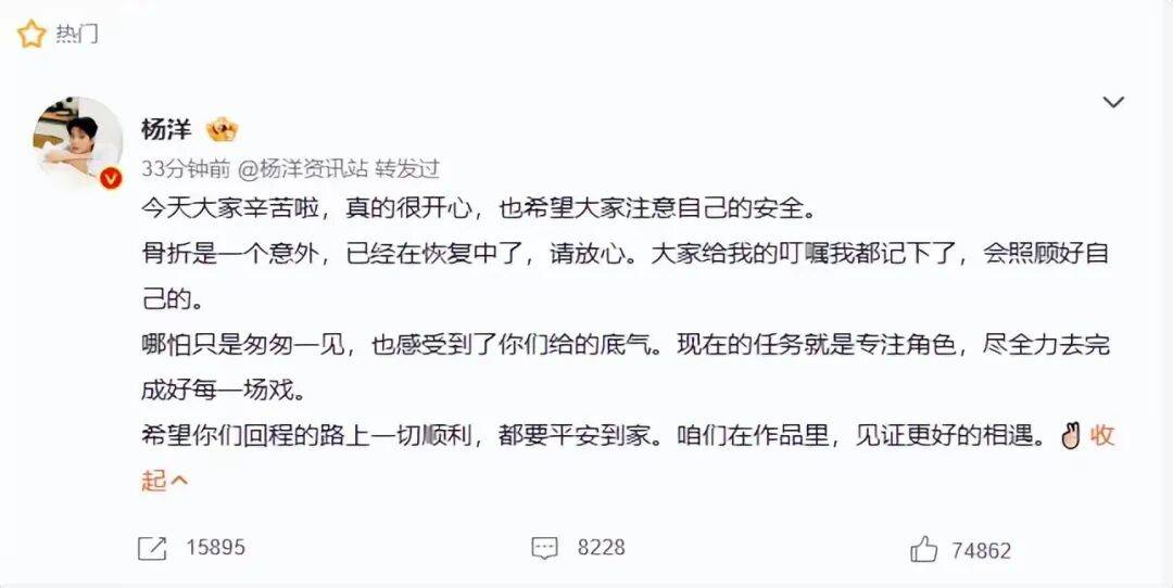 杨洋这回是真没藏着掖着。《不让江山》开机那天,他左手打着纱布就来了,被问到是不是受伤了,直接承认——练武打动作的时候不小心摔的,左手骨折,现在养得差不多了。末了还补了一句,让粉丝都注意安全,别学他。