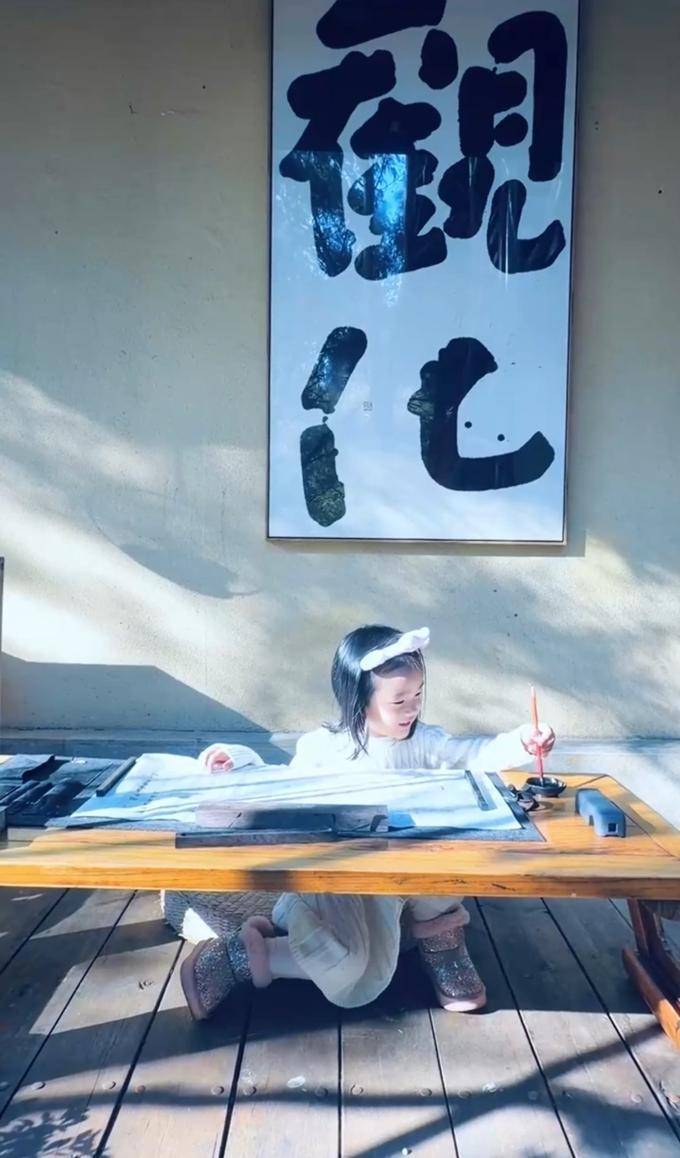 转眼间,夏夏盘腿再坐木桌上,手持毛笔模棱两可地书写书法,背后还有一个大字,斑驳光影中,看去乖巧而有范。