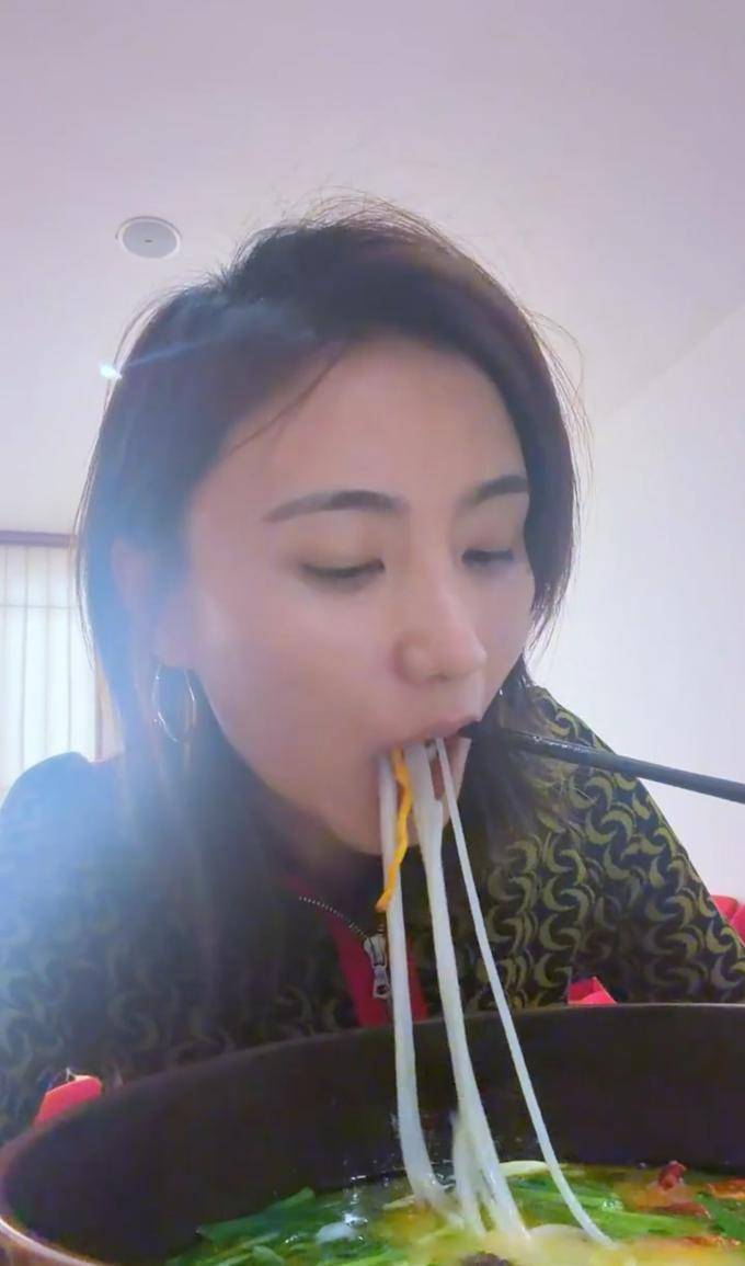 镜头转过身来,她正在用筷子紧紧地夹住一大把米线,然后仰起头,大口地将其送入口中,吃得既美味又全身心地投入其中,完全沉醉在这道美食之中。