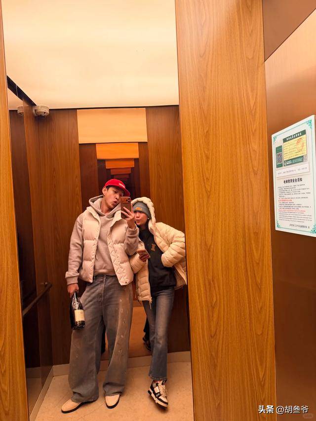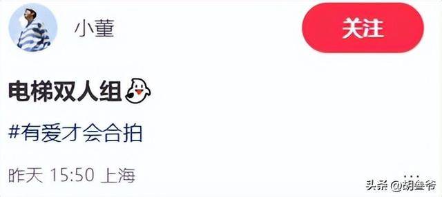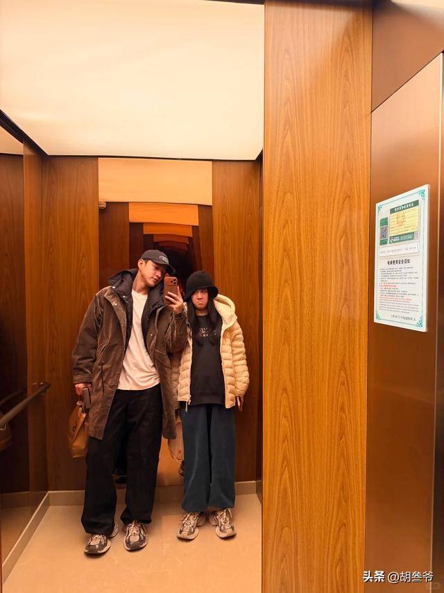 小董晒出的照片中,电梯里的灯光柔和,两人靠得很近,脸上带着自然的笑容。