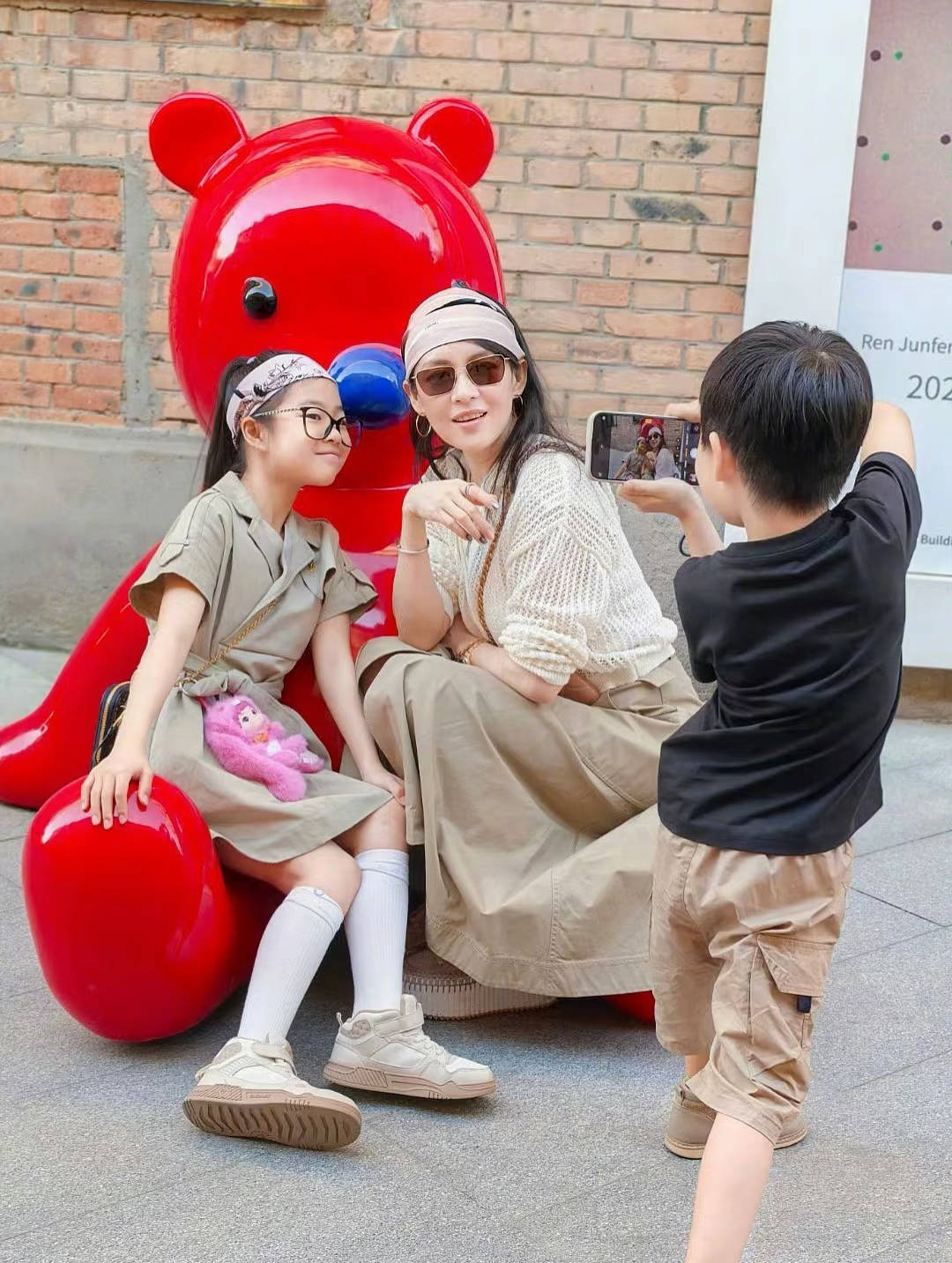 母女三人还在巨型熊猫前合影了,10岁的醒醒穿白色T恤、阔腿裤,看着身高已经到妈妈耳朵了,最少也得有150cm了。