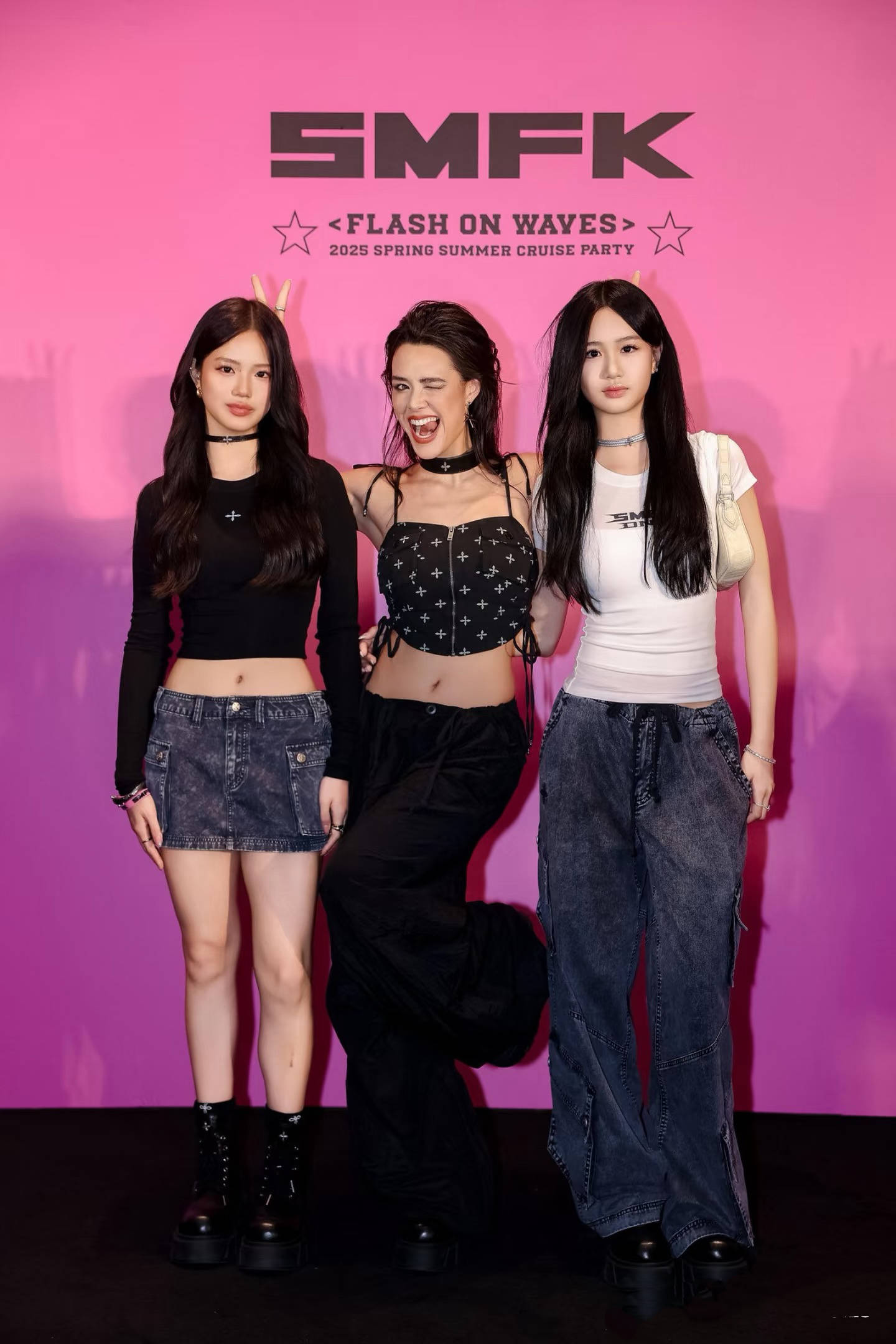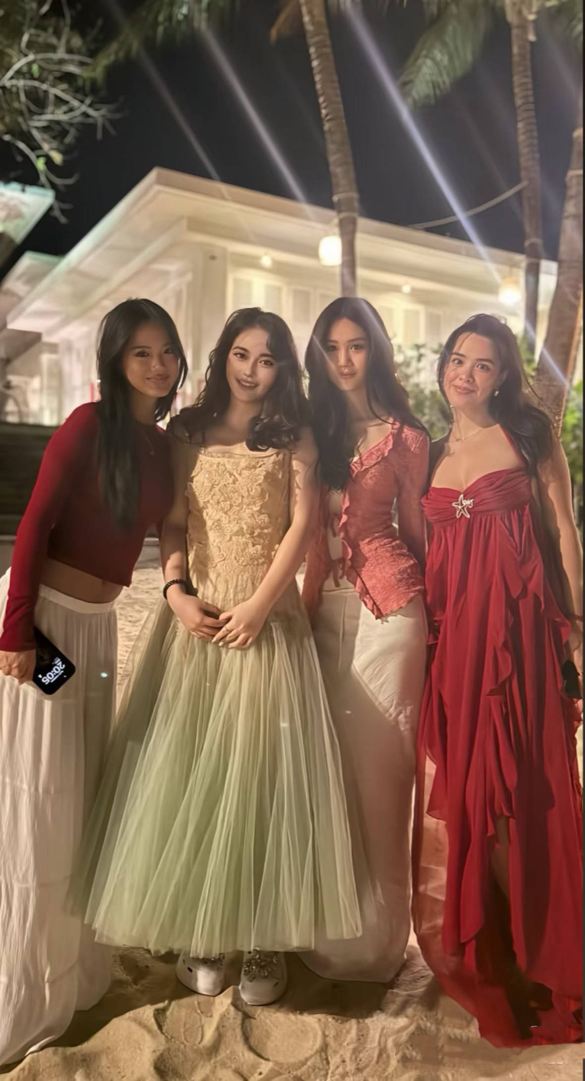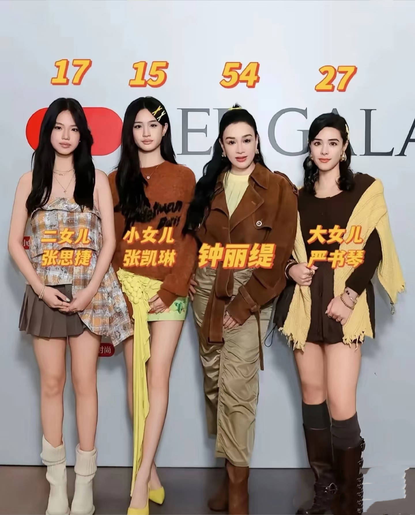 大女儿穿着红色吊带裙,留着披肩长发、是很性感大方的那种美。钟丽缇就在女儿们身后,穿粉色裙子好显嫩。