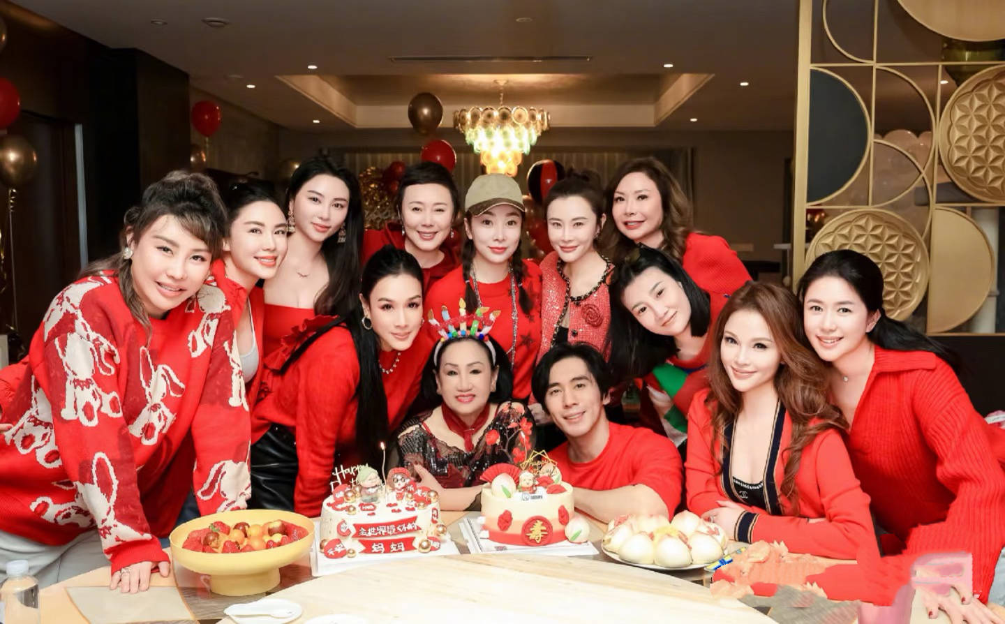 一家人一起给钟丽缇妈妈庆生的照片,钟丽缇和张伦硕分别在妈妈的两侧,张伦硕像是蹲在地上、因为他要比岳母矮一点。