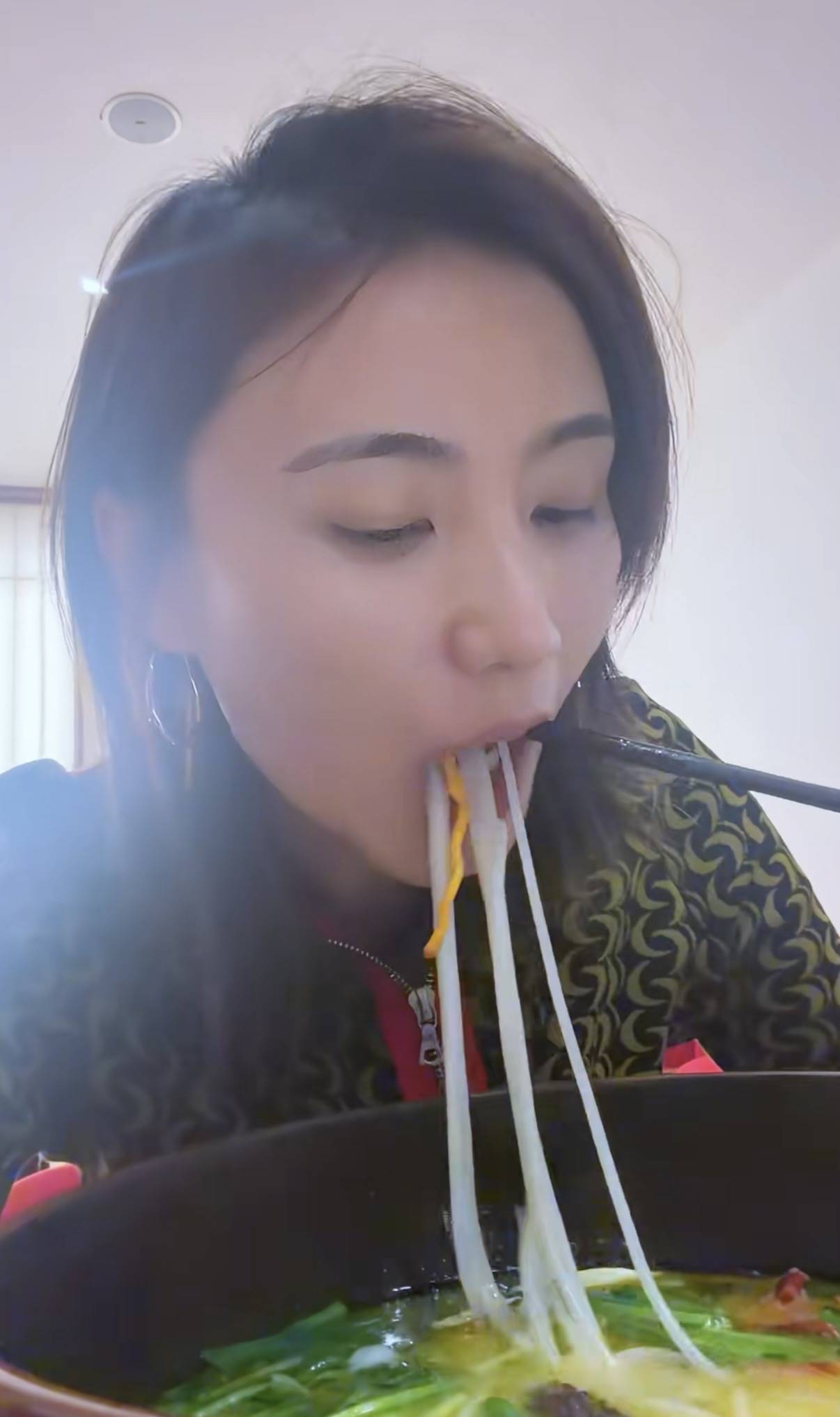 金喜大口吃着云南米线,满满一大碗汤料都很足,这样的米线吃着超过瘾。是一人一锅的那种,自己想吃什么配菜都可以加到自己的锅里,方便卫生、分量够大。