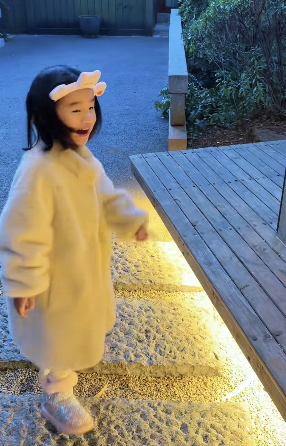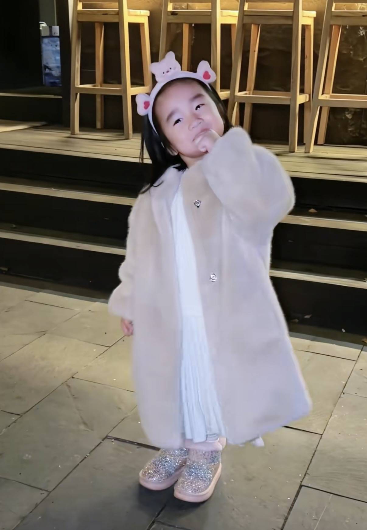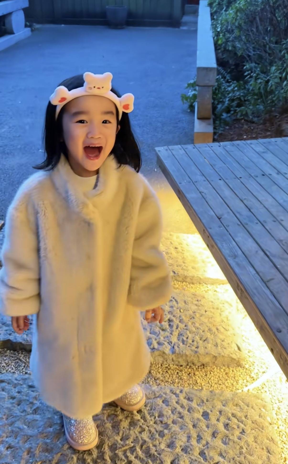 夏夏穿了一件环抱皮草,温暖又可爱的模样真是太叫人喜欢了。看着夏夏开心的模样,大概是见到爸爸时候的惊喜吧。