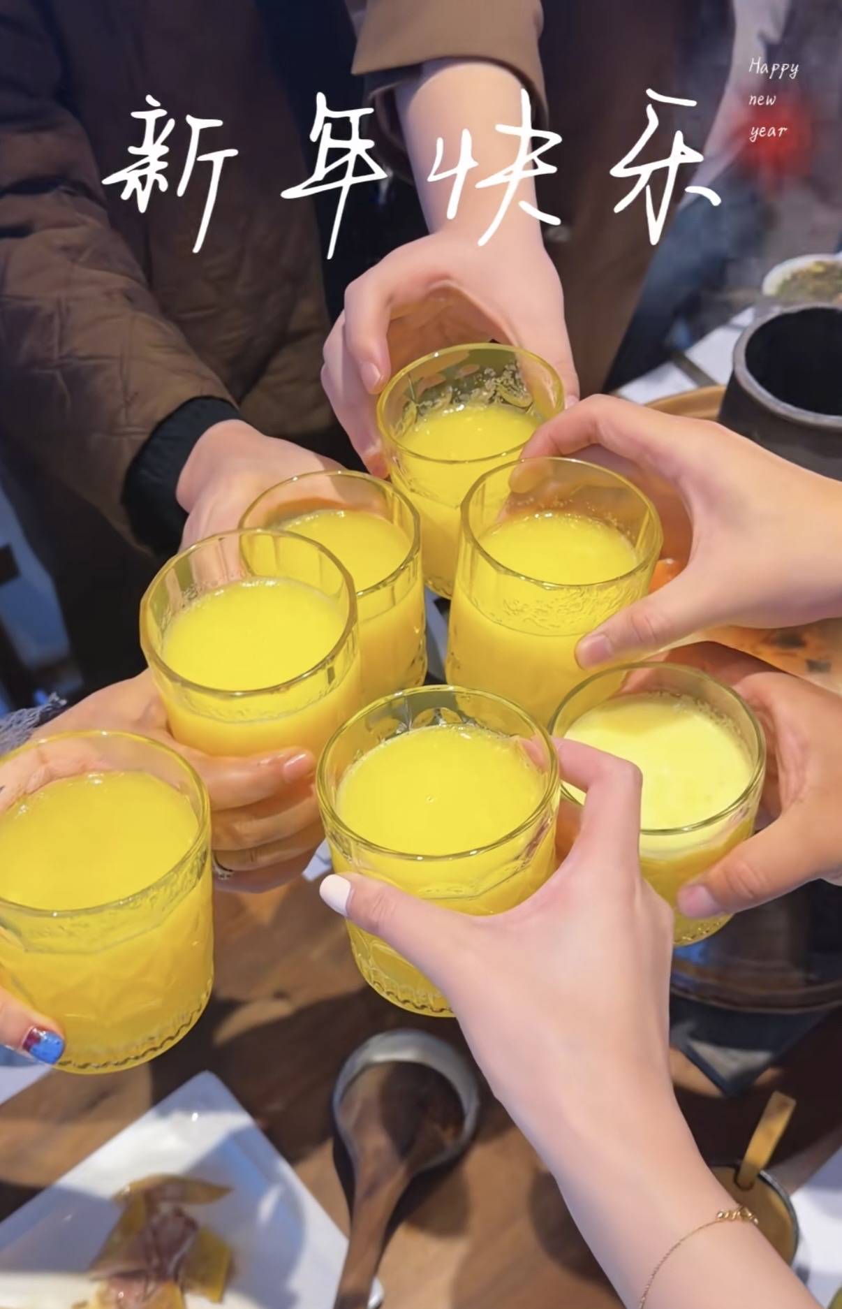 大家一起举杯,这份团聚的喜悦看得人心里暖暖的。所有人都是喝的果汁,并没有人喝酒。毕竟吃米线、没什么硬菜,也不好下酒。