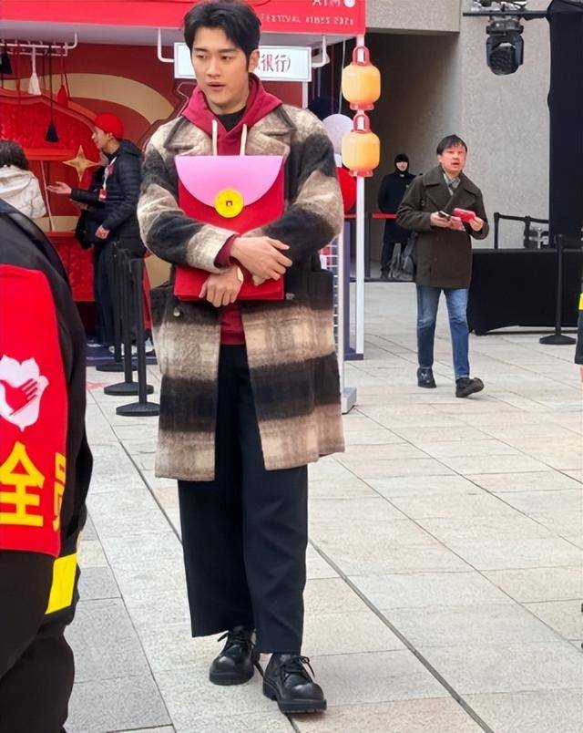 金莎当天穿了一件长款羽绒大衣,头上的针织帽把额头遮了大半,搭配得比较厚重,脖子上还系着一条红色围巾,年味是有了,但是看上去有点老气。