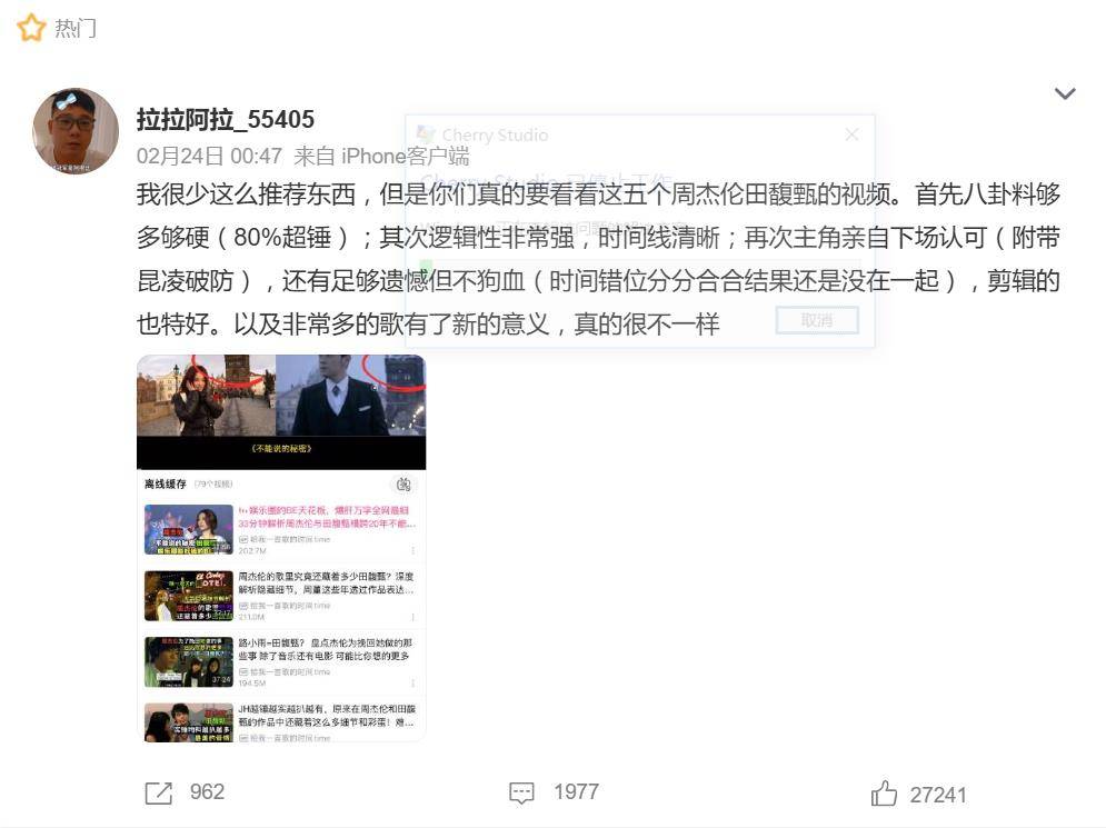 视频还将2006年周杰伦被曝飞赴英国陪伴游学的田馥甄、同游伦敦唐人街等陈年旧闻,列为“高糖节点”。这套组合拳下来,视频播放量轻松突破百万,精准击中了公众对千禧年代那种含蓄、暧昧情感模式的怀旧情绪,被不少人奉为“周田恋考古天花板”。