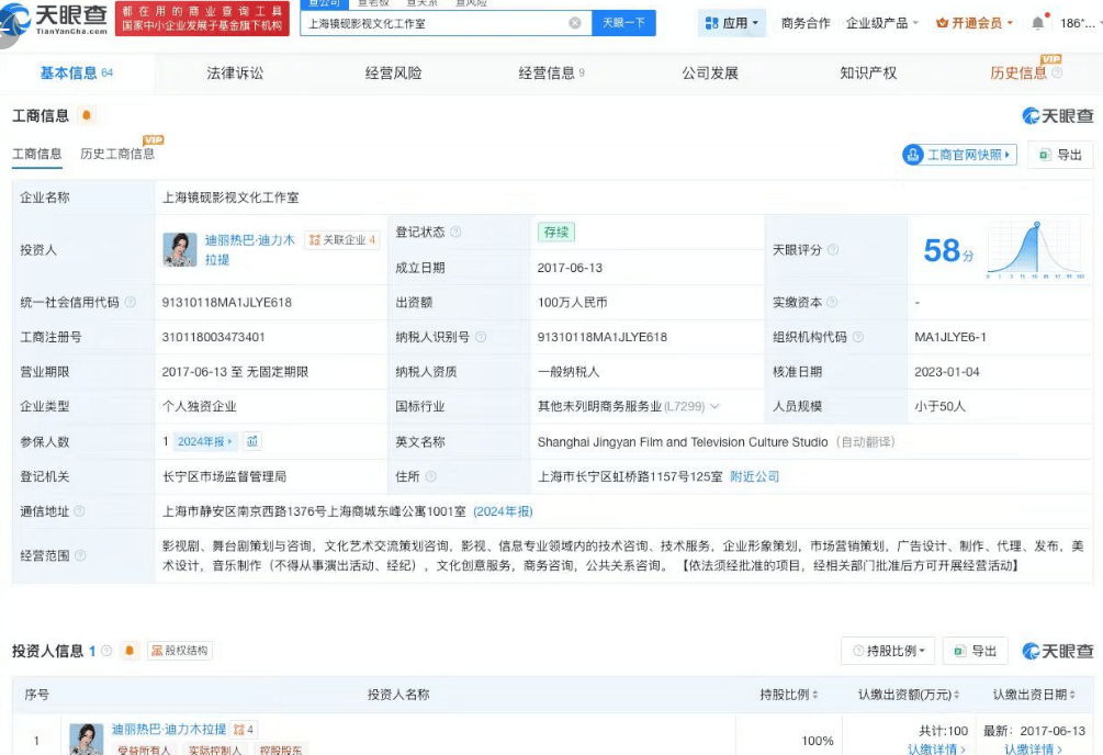 据天眼查任职信息显示,迪丽热巴·迪力木拉提名下关联多家企业,其中上海镜砚影视文化工作室为其个人独资企业。该工作室成立于2017年6月,出资额100万人民币,经营范围包括