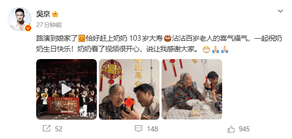 2月26日,吴京在社交平台分享和谢楠奶奶的合照,并表示“赶上奶奶103岁大寿,沾沾百岁老人的喜气福气,一起祝奶奶生日快乐!”