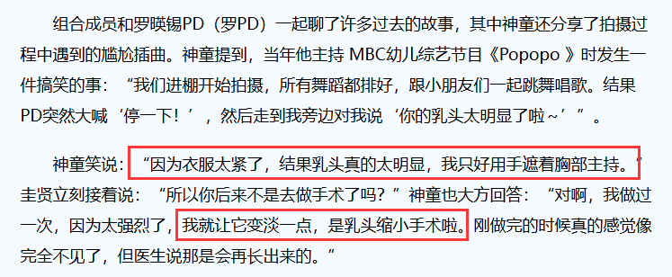 因为身材的关系,神童上镜时要比成员们做更多努力,曾经因为衣服紧,显得rt太大,被指出后他选择去做了rt缩小手术。