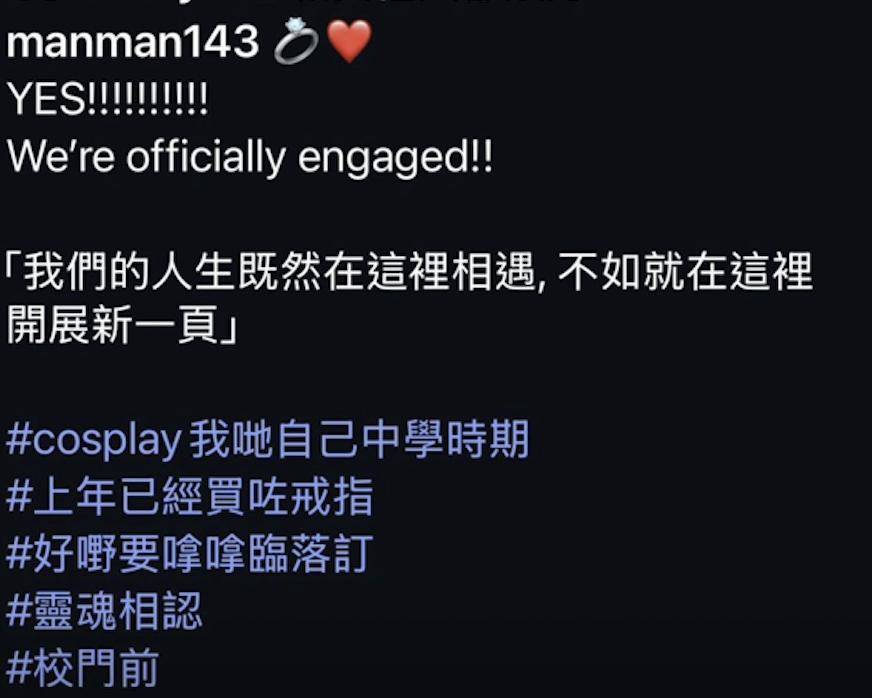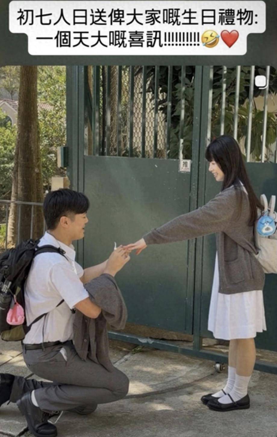 陈耀淙在社交平台上晒出了向女友求婚的视频,而他的这个求婚仪式大概也是经过了精心的设计。只见他与女友分别穿上了读书时的校服。陈耀淙穿了灰色的校裤,白色的衬衣,还背上了书包,女友穿上了白色的校裙,灰色的针织开衫,两人的打扮都很学生的既视感。陈耀淙跪在女友的跟前,为女友戴上了求婚戒指,两人笑容满满,流露出一脸幸福感。陈耀淙留言称,初七送给大家的生日礼物,一个天大的喜讯,喜讯就是求婚成功了。