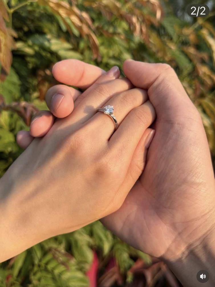 除了晒出身穿校服求婚的视频,陈耀淙还晒出了求婚戒指。他握着女友的手,还放大了女友手上的戒指——女友中指上那枚钻石戒指格外闪耀,看起来卡数还真是不小,陈耀淙称戒指在2025年就已经买好了,显然他是有计划求婚的。
