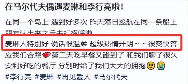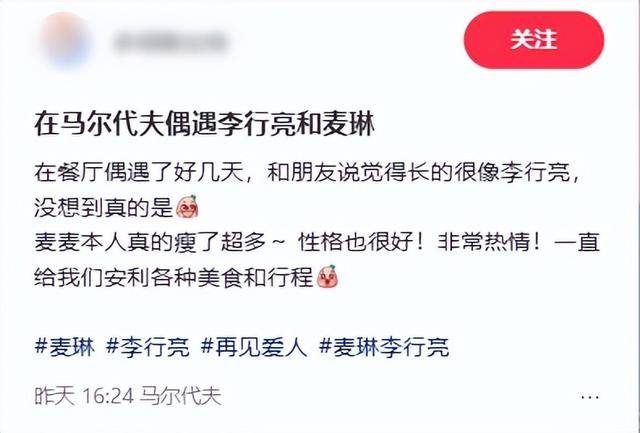 近日有网友在马尔代夫的度假酒店碰到了麦琳和李行亮夫妻俩,生图一放出来画面直接刷新了所有人的认知。