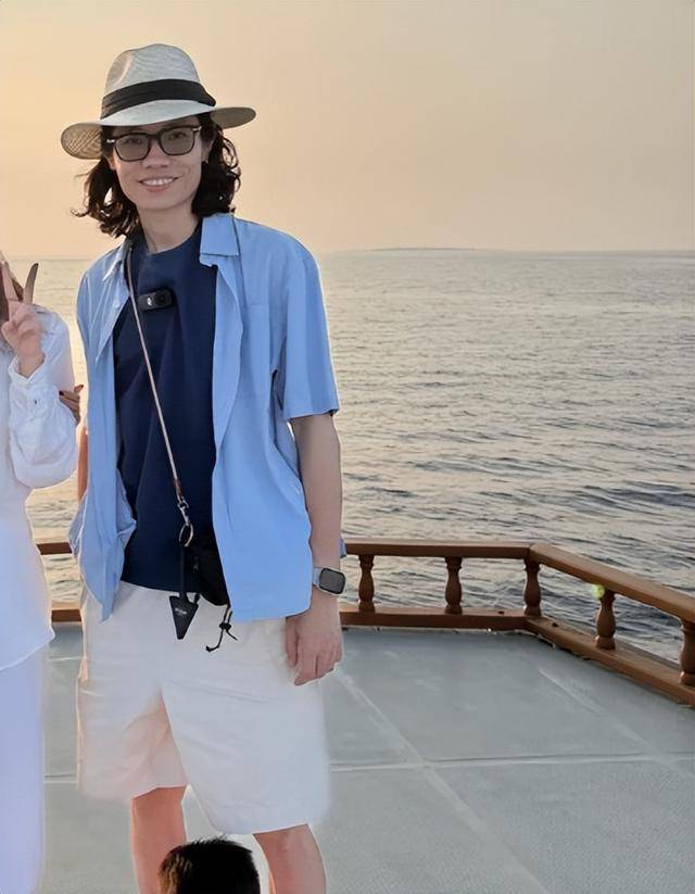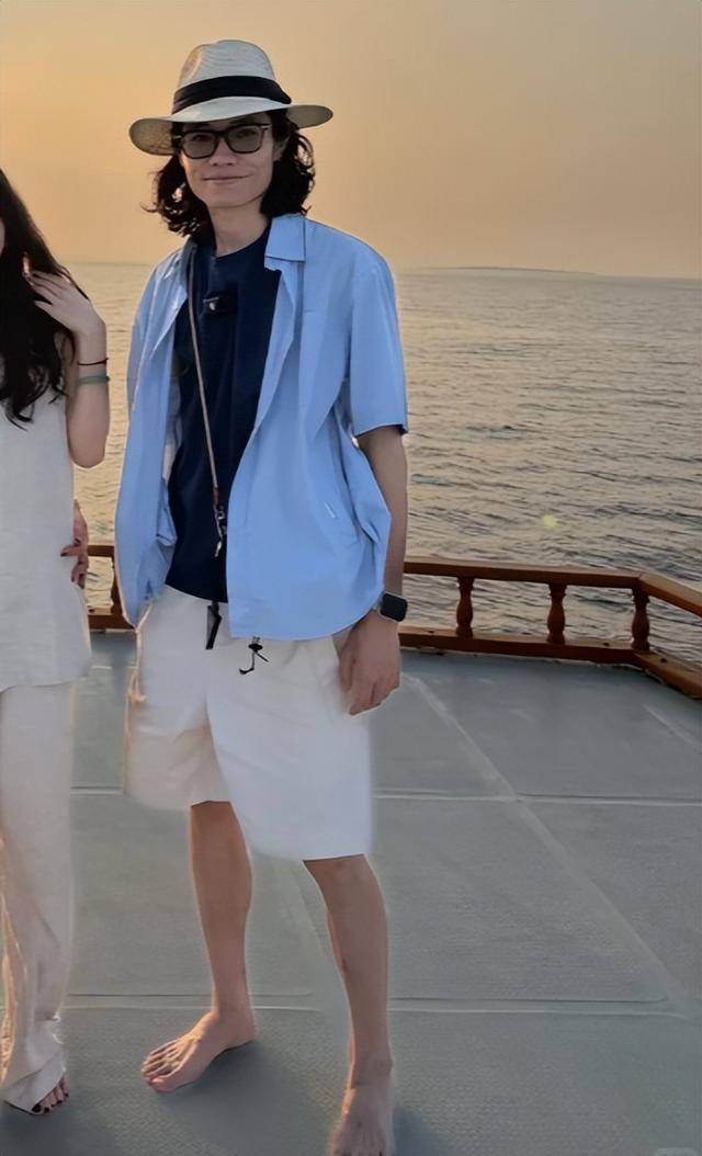 他当天穿了一件宽松的浅色衬衣,搭配休闲的沙滩短裤,头上戴了一顶遮阳帽,整个人的穿搭清爽又随性。