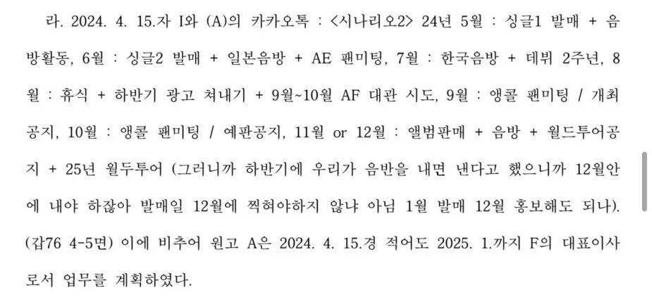 法庭文件揭示了一份日期为2024年4月15日的KakaoTalk对话记录,其中清晰列出了一份名为“<方案2>”的宣传路线图。这份计划细致到月度安排:从2024年5月发行单曲、6月进行日本宣传、7月庆祝出道两周年,到8月尝试预订下半年大型演出场馆,再到9月、10月筹备安可粉丝见面会。最引人注目的规划出现在年末——计划在2024年11月或12月发布新专辑并进行打歌宣传,同时公告世界巡演,并明确将2025年进行世界巡演列为核心目标。