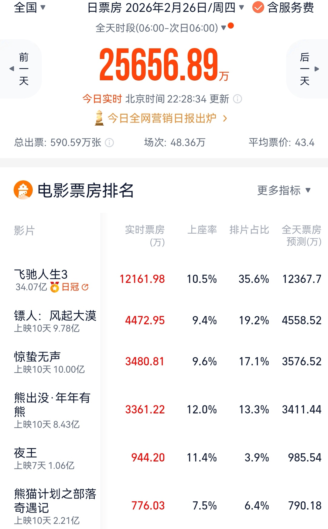 2月26日,在上映第十天,韩寒的《飞驰人生3》累计票房突破了34亿元,超过了《飞驰人生2》的33.61亿元,创系列新高。预计该片最终总票房可能超过43亿元。