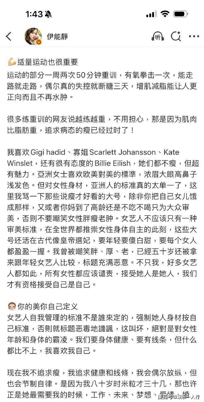 她的体重现在维持在104斤左右。这个数字对很多追求“两位數体重”的女孩来说可能不够“完美”,但伊能静给出了一个无法反驳的理由:年纪上来了,脸部胶原蛋白会自然流失,需要一定的脂肪和肌肉来支撑面部轮廓,太瘦了反而会显老态、显憔悴。她明确说:“保持一点点脸蛋的胶原感和健康气色,比极致的瘦更重要。”这直接挑战了娱乐圈乃至社会长久以来“以瘦为美”的单一审美霸权。她区分了两种身份:作为普通女性,她反对身材焦虑,认为每一种健康的身材都值得欣赏;作为女艺人,保持好状态是工作责任,但这个“好状态”的定义,已经从单纯的“瘦”变成了整体的“健康”。