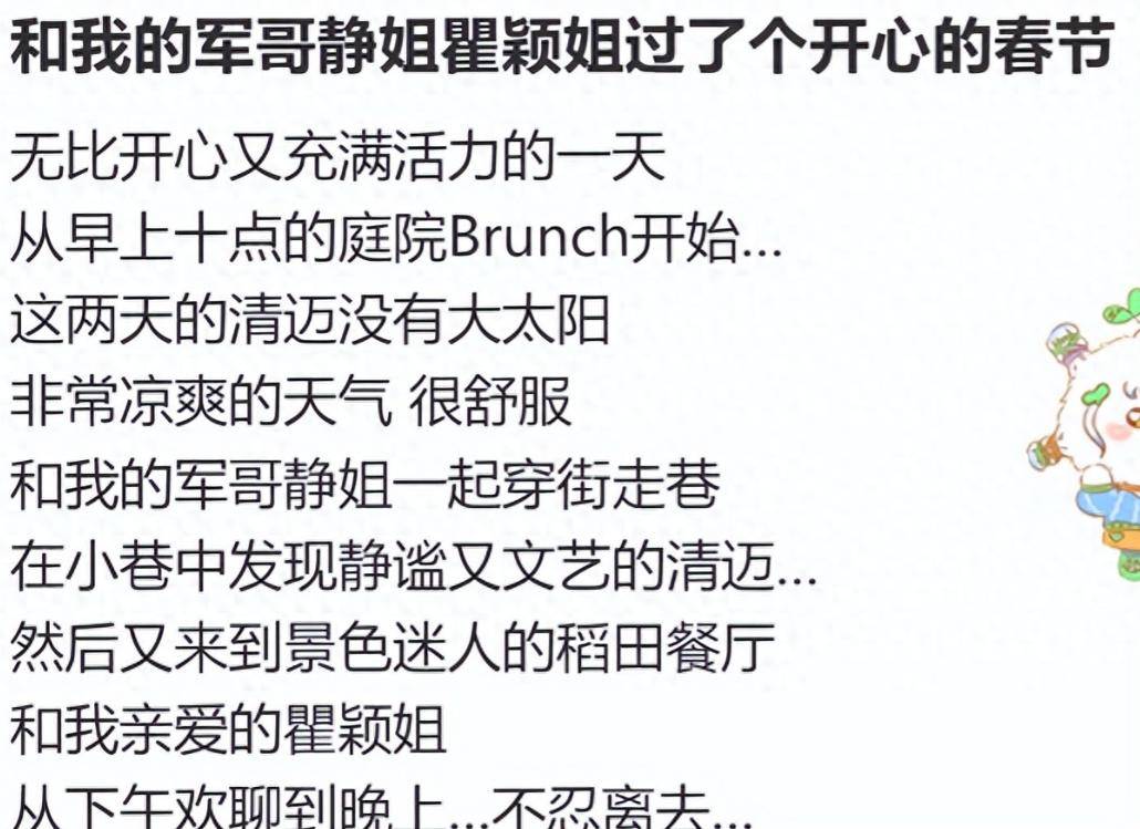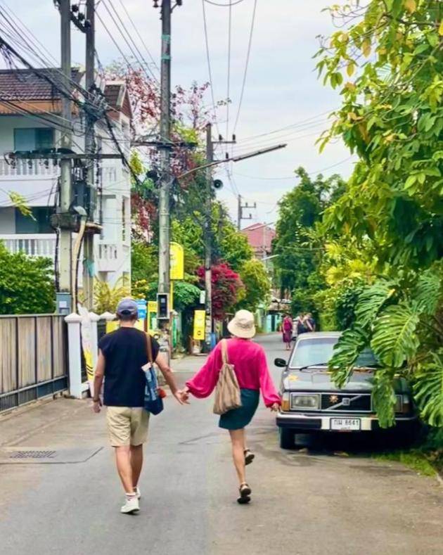 李静这次是专门飞过去找他的,两个人认识超过三十年,逢年过节能见一面也是挺难得的,2月26号,有朋友把他们在清迈一起过春节的照片发出来,吃早午饭、在小巷子里溜达,看着几个人玩得都挺高兴