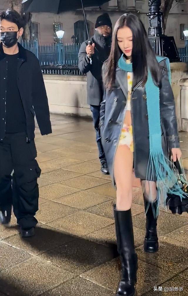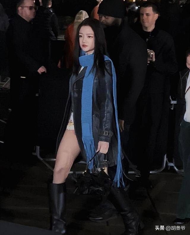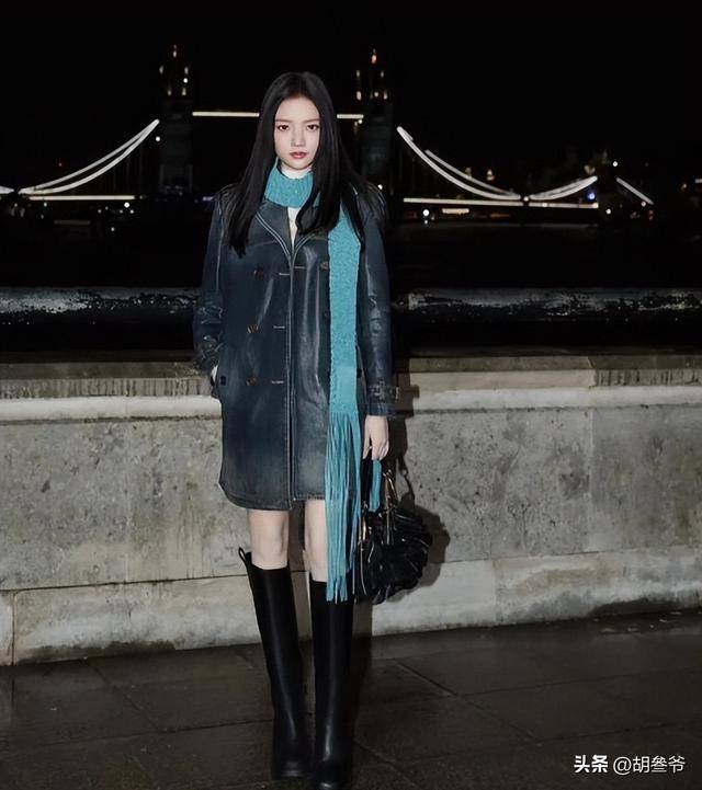 她一袭深蓝色收腰牛仔风衣搭配湖蓝色钩针围巾,踩着高筒靴亮相,黑长直的发型衬得她头肩比格外优越。