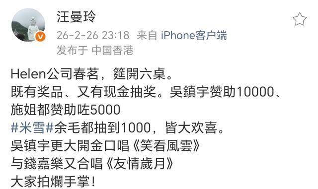 随着春节假期的结束,吴镇宇回到香港,参加Helen公司春茗,同场的嘉宾还有余慕莲、米雪、钱嘉乐、汤盈盈、粤剧班主彭美施等。据资深媒体人汪曼玲透露,Helen公司春茗设宴六桌,有奖品,又有现金抽奖。其中,吴镇宇赞助1万,施姐赞助5000,米雪和毛姐抽到1000,皆大欢喜。吴镇宇更是大秀歌喉,独唱《笑看风云》,还和钱嘉乐合唱《友情岁月》,现场掌声阵阵。