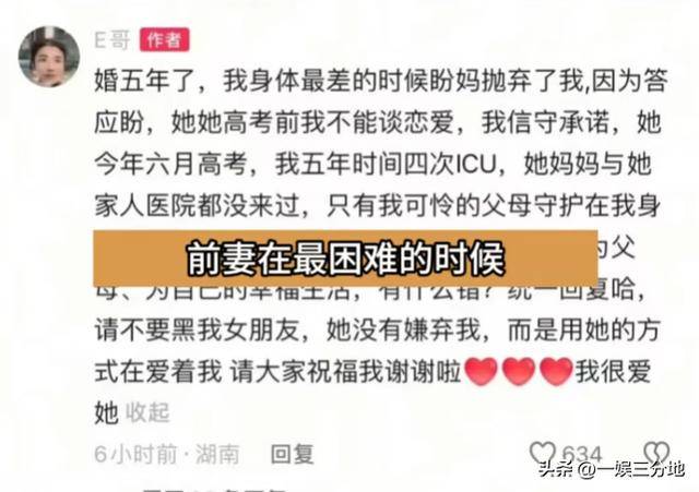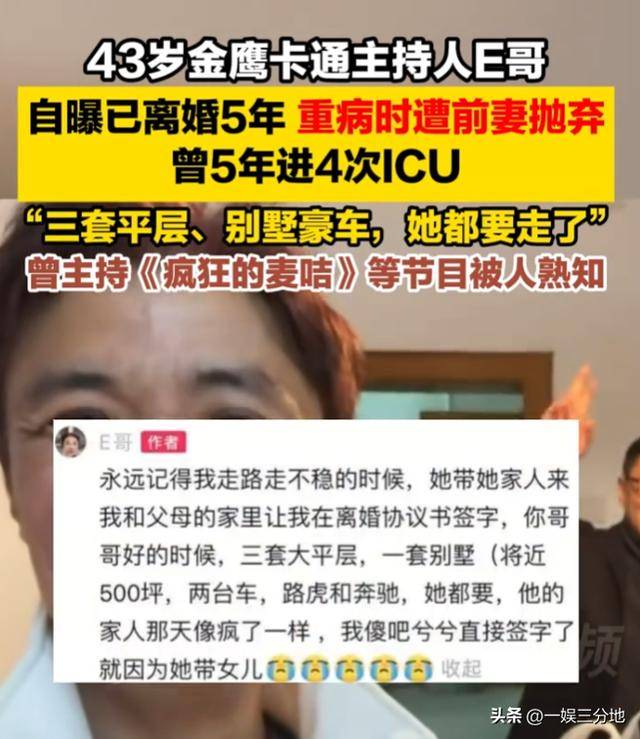 就在网友疑惑的时候,E哥在评论区回复,自爆已经离婚5年了,他这些年身体一直有问题,严重的时候五年时间里进了4次ICU。