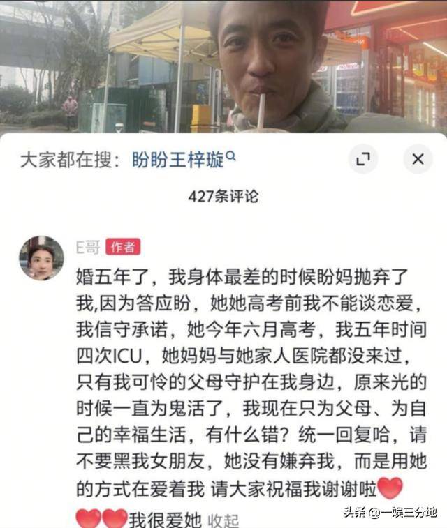 E哥还特别说明,是因为自己和女儿约好了,孩子高考前自己不会谈恋爱,他也一直信守承诺,还恳请大家不要网曝自己的新女友,称她很好,从来没有嫌弃自己。