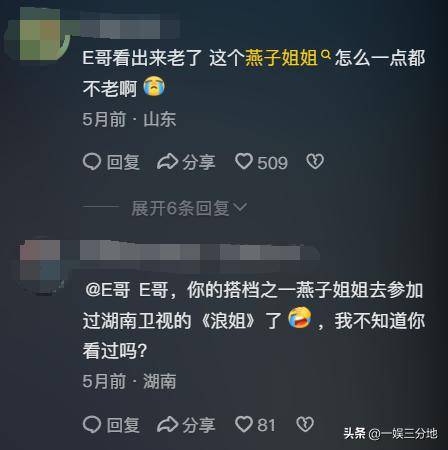 看到两人的合照后,评论区的网友都说,E哥看出来老了,燕子姐姐怎么一点都不老。