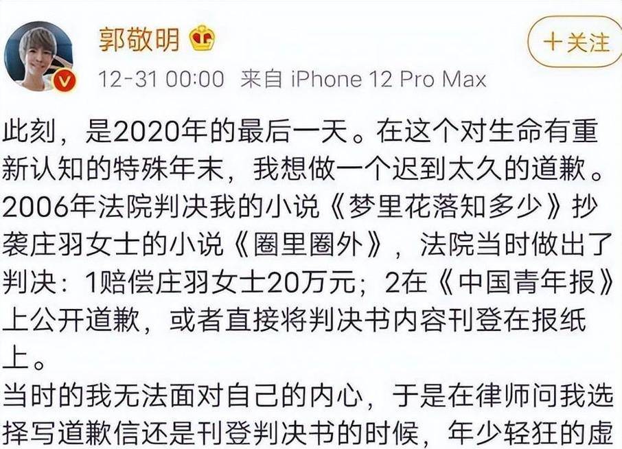 郭敬明的争议从未停止,早期《梦里花落知多少》被指抄袭庄羽的《圈里圈外》,官司最终判他侵权,需赔偿并公开道歉,但他始终未正视,导致口碑下滑。