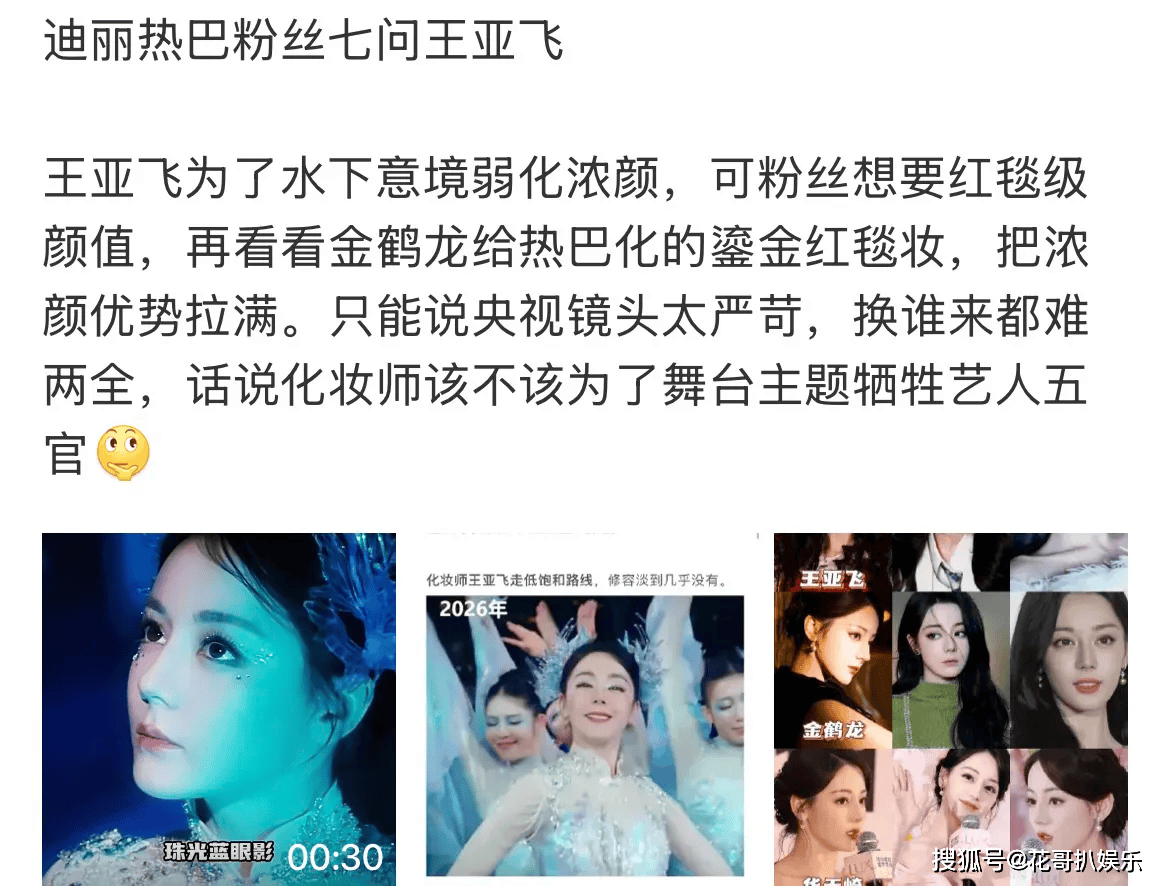 粉丝的不满在这一刻彻底爆发,连夜整理出一份堪称檄文的七问,直接将王亚飞推上了舆论风口。这七问字字戳中核心,从为何始终弱化迪丽热巴标志性的眉眼优势,到修容失当让立体五官变得扁平,再到屡次无视粉丝建议坚持模板化妆,每一个问题都指向了王亚飞长期以来的无效化妆操作。在粉丝看来,这次春晚的妆容翻车绝非偶然,而是化妆师失职,甚至阴谋论他和别人勾结,故意这么恶搞迪丽热巴。