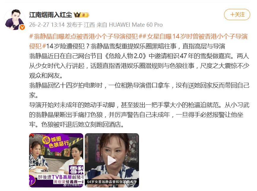 在节目《危险人物2.0》中,翁静晶与相识47年的好友雪梨畅谈少女时代入行经历,话题之大胆直接让观众瞠目。翁静晶回忆,那是在1978年,年仅14岁的她拍摄电影期间,一位“相熟”的导演以“取车送她回家”为借口,将她带至私人住所。随后,对方不仅言语暧昧、动手动脚,更掏出一把“手掌大小的手枪”进行胁迫,意图侵犯未成年少女。