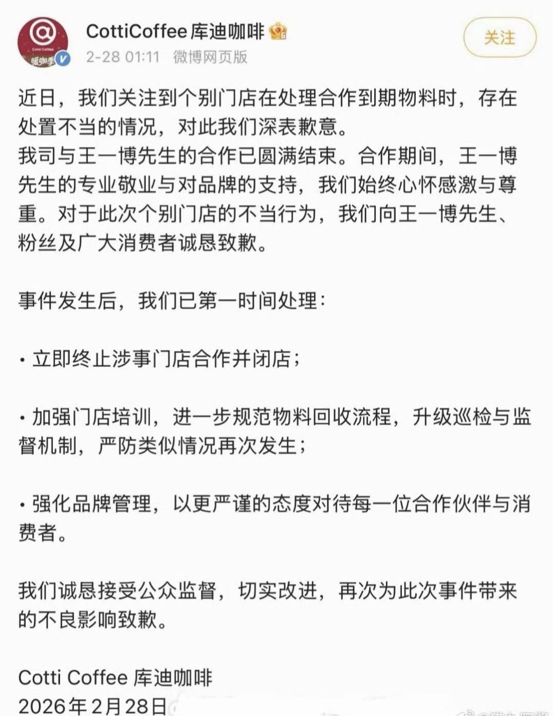库迪咖啡的操作真是让人直呼“好家伙”。王一博合约到期,按规矩销毁物料本来没啥,但库迪员工愣是把这“分手现场”拍成了短视频发上网。