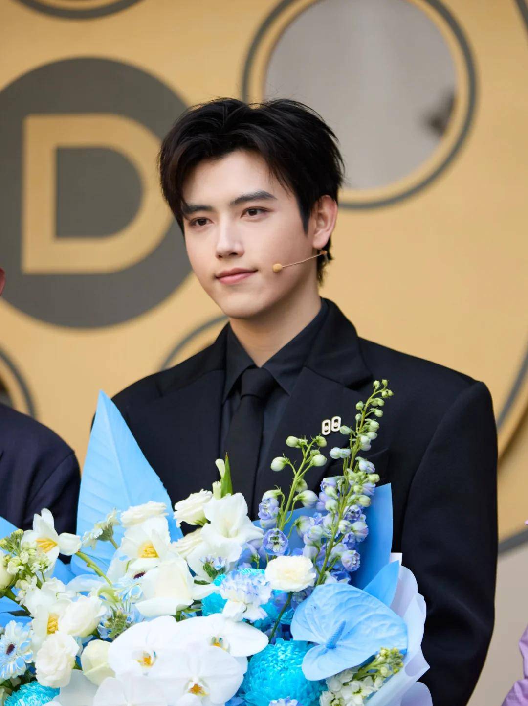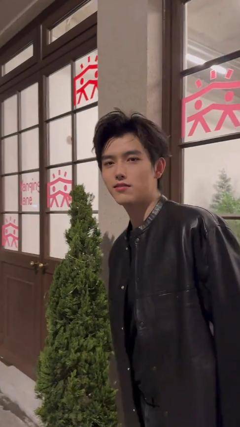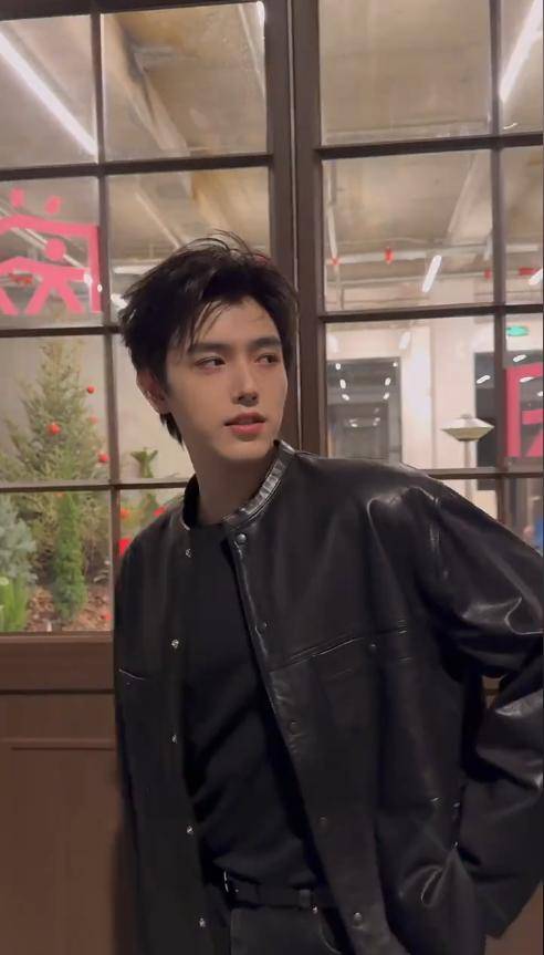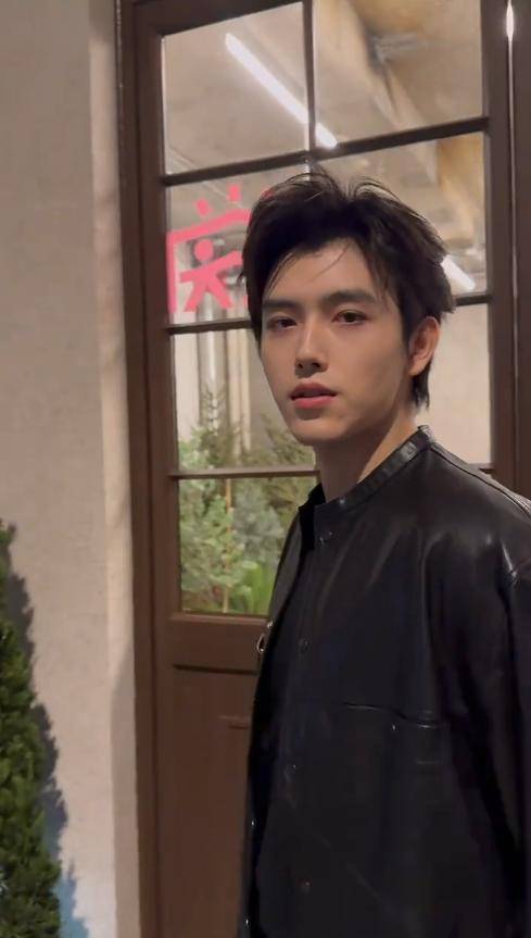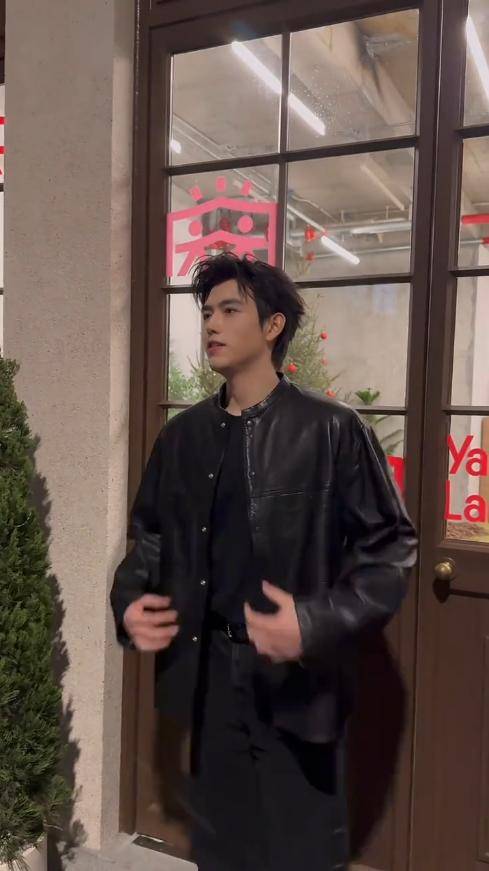 当天他穿了一件黑色皮衣,版型利落,衬得他肩宽腰窄,身形愈发挺拔。